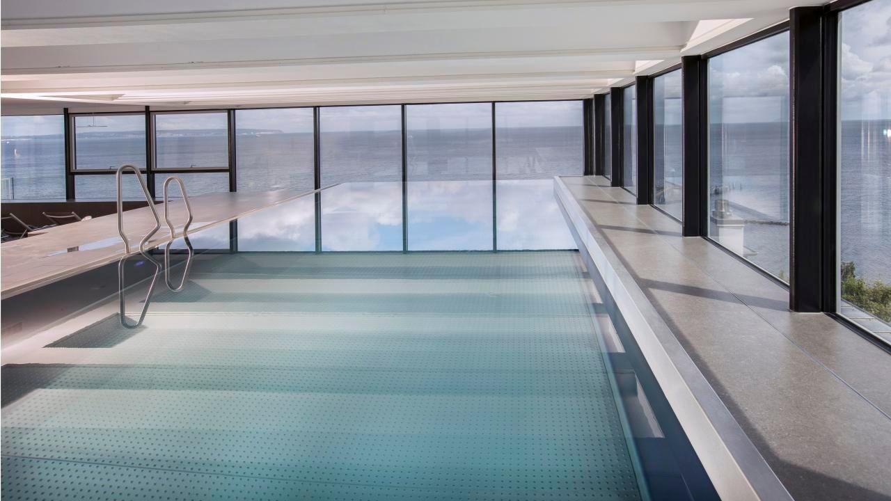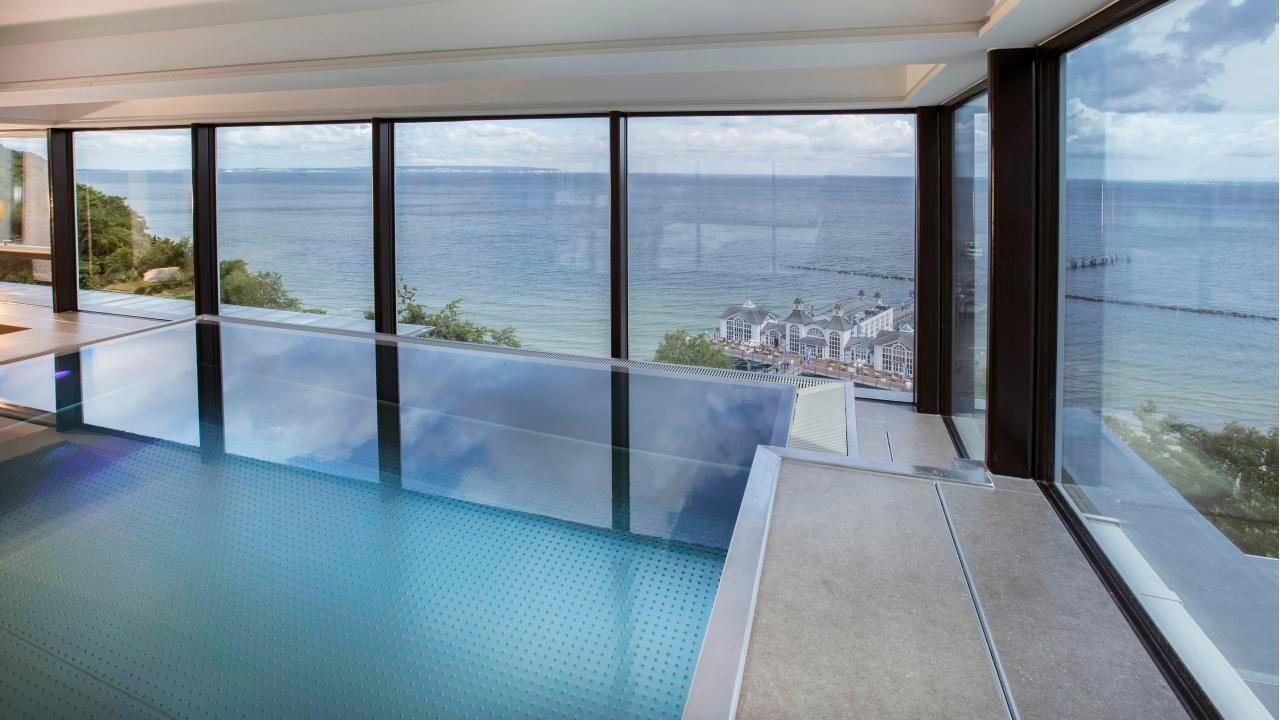 Auf 84m² ist unsere großzügige Entspannungsoase entstanden mit Indoor-Infinity Pool und Saunalandschaft. Während dem entspannen im Wellnessbereich kann man die weiten des Meeres genießen mit Blick bis zum Kreidefelsen.