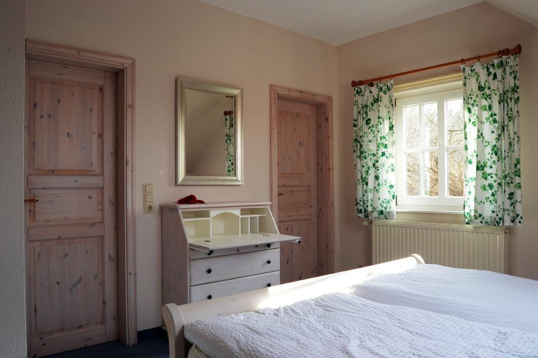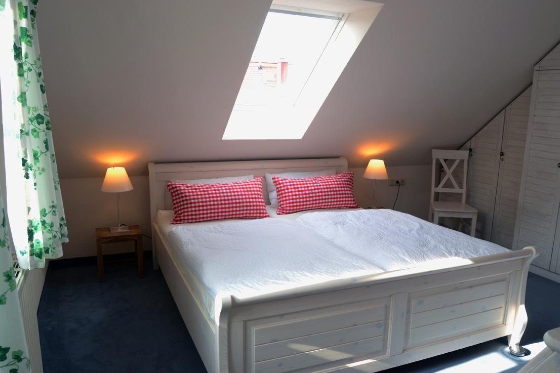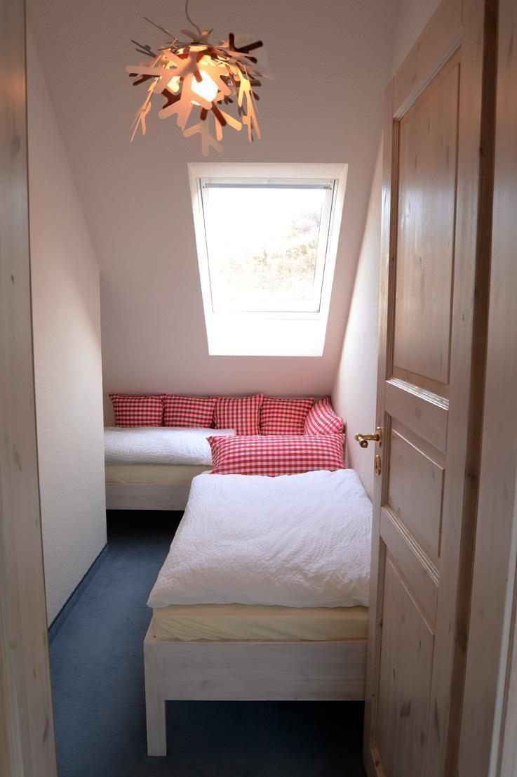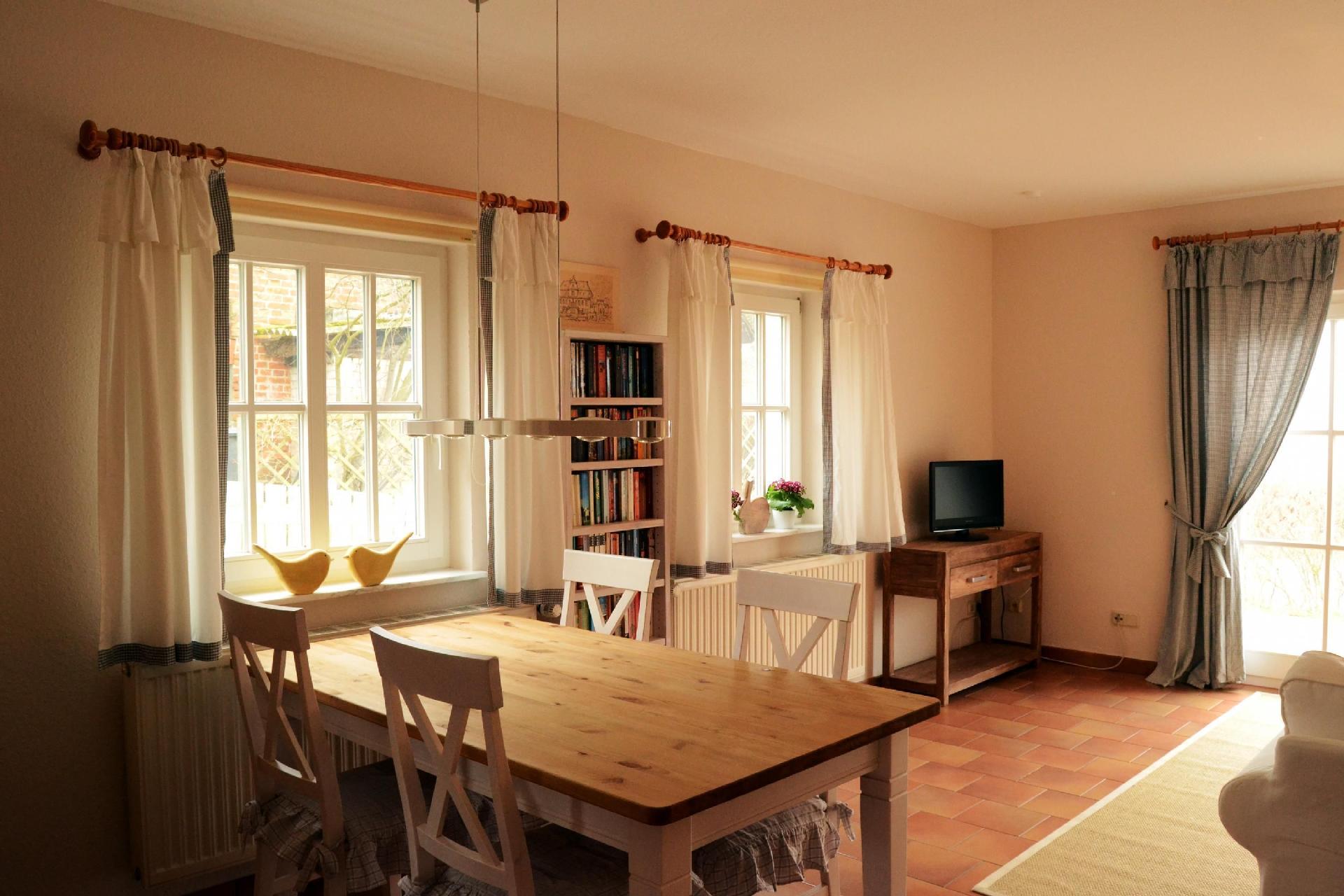 Das Ferienhaus ist 1995 gebaut, in 2013 komplett modernisiert und neu möbliert, hat 67 qm Wohnfläche und verfügt über einen eigenen Parkplatz Nr.4 hinter dem Haus und den Fahrradabstellraum Nr.4. Im Erdgeschoss liegen der helle Wohnraum mit der davor liegenden großen SW-Terrasse, die separate Küche - 2022 neu möbliert , ein kleiner Abstellraum, WC und Eingangsflur. Im Obergeschoss befindet sich ein großes Schlafzimmer mit Doppelbett, einem großem Einbauschrank, und einem Schreibsekretär mit Schubladen; ferner gibt es ein sehr kleines Schlafzimmer mit zwei Einzelbetten (Bettenlänge nur 1,85m, eher für Kinder gedacht). Das Duschbad mit tiefer Duschwanne, WC und einer neuen Waschmaschine ist über das Hauptschlafzimmer erreichbar (siehe Fotos)! Der Wohnbereich im Untergeschoss ist ausgestattet mit bequemer Schlafcouch, Couchtisch und Sessel. Ein Sat-TV ermöglicht auch ausgezeichneten Radioempfang nichtlokaler Radiosender. Der gemütliche Essbereich mit großem Holztisch und vier Stühlen vervollständigt den Raum. Eine Urlaubsbibliothek und ein Spielesortiment stehen Ihnen zur Verfügung. Die Küche ist voll ausgestattet mit großem Kühlschrank mit Gefrierfach, Mikrowelle mit Grill, großem Herd mit Backofen und Dunstabzugshaube, einer Geschirrspülmaschine, Kaffeemaschine sowie kleinem Espressokocher, Toaster und schönem Geschirr. Der Gewürzschrank ist gefüllt.