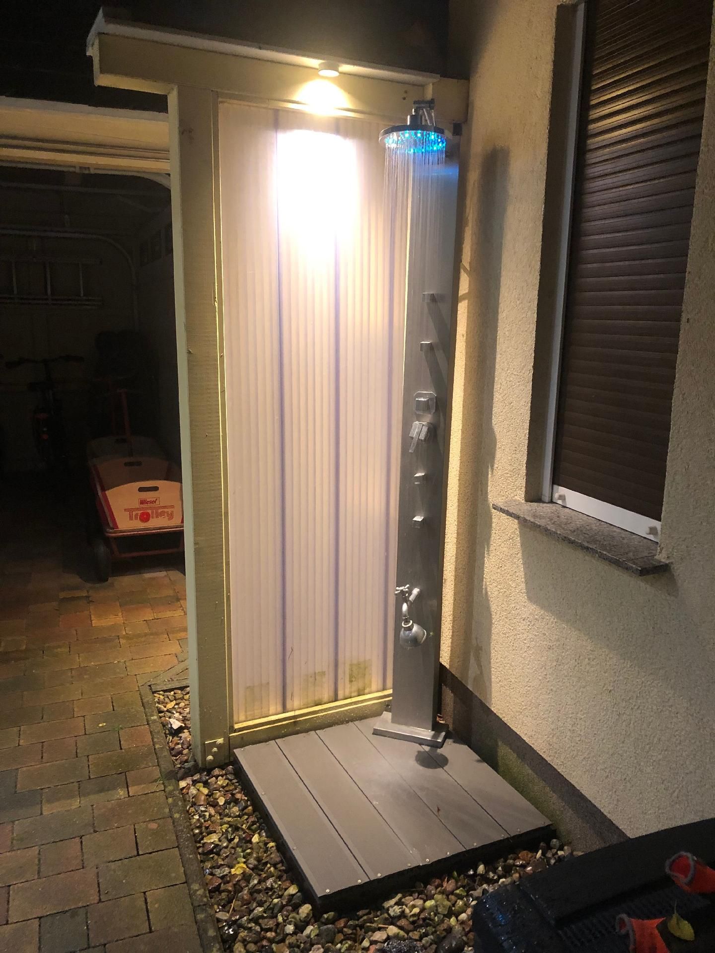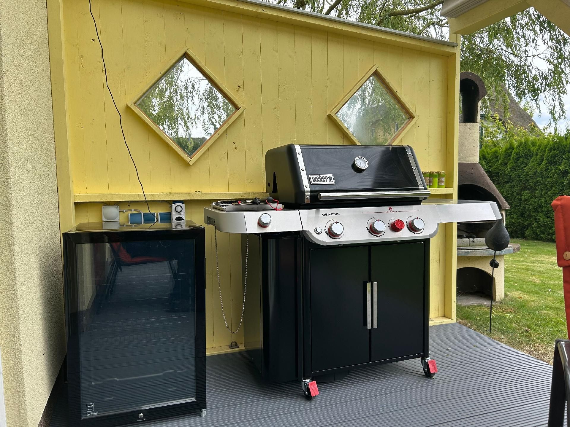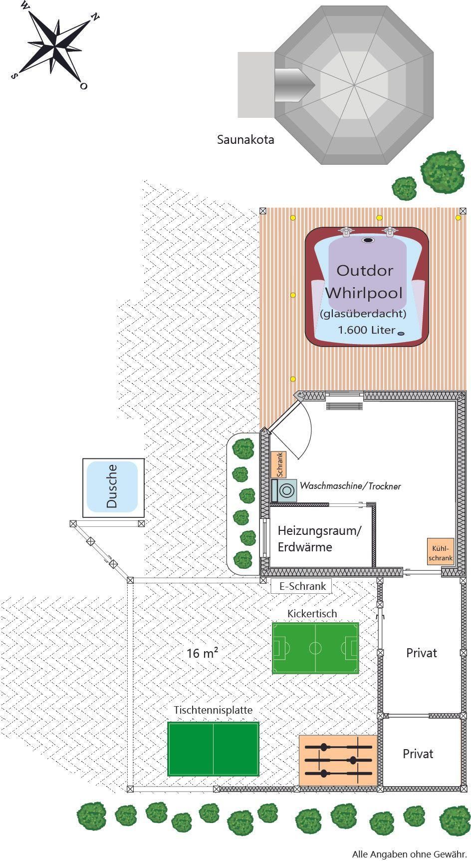 Der großzügige Außenbereich umfasst eine rundum sichtgeschützte, eingefriedete Terrasse mit südwestlicher Ausrichtung, auf der sich neben einem Kamingrill und einem Weber Gasgrill auch ein Outdoor Kühlschrank finden. Für Entspannung sorgen eine finnische Sauna Kota und ein überdachter Outdoor Whirlpool sowie eine Outdoor Dusche. Die Terrasse und der Garten, romantisch beleuchtet mit LED-Bodenstrahlern, laden ein, die Abende unter freiem Sternenhimmel zu genießen.