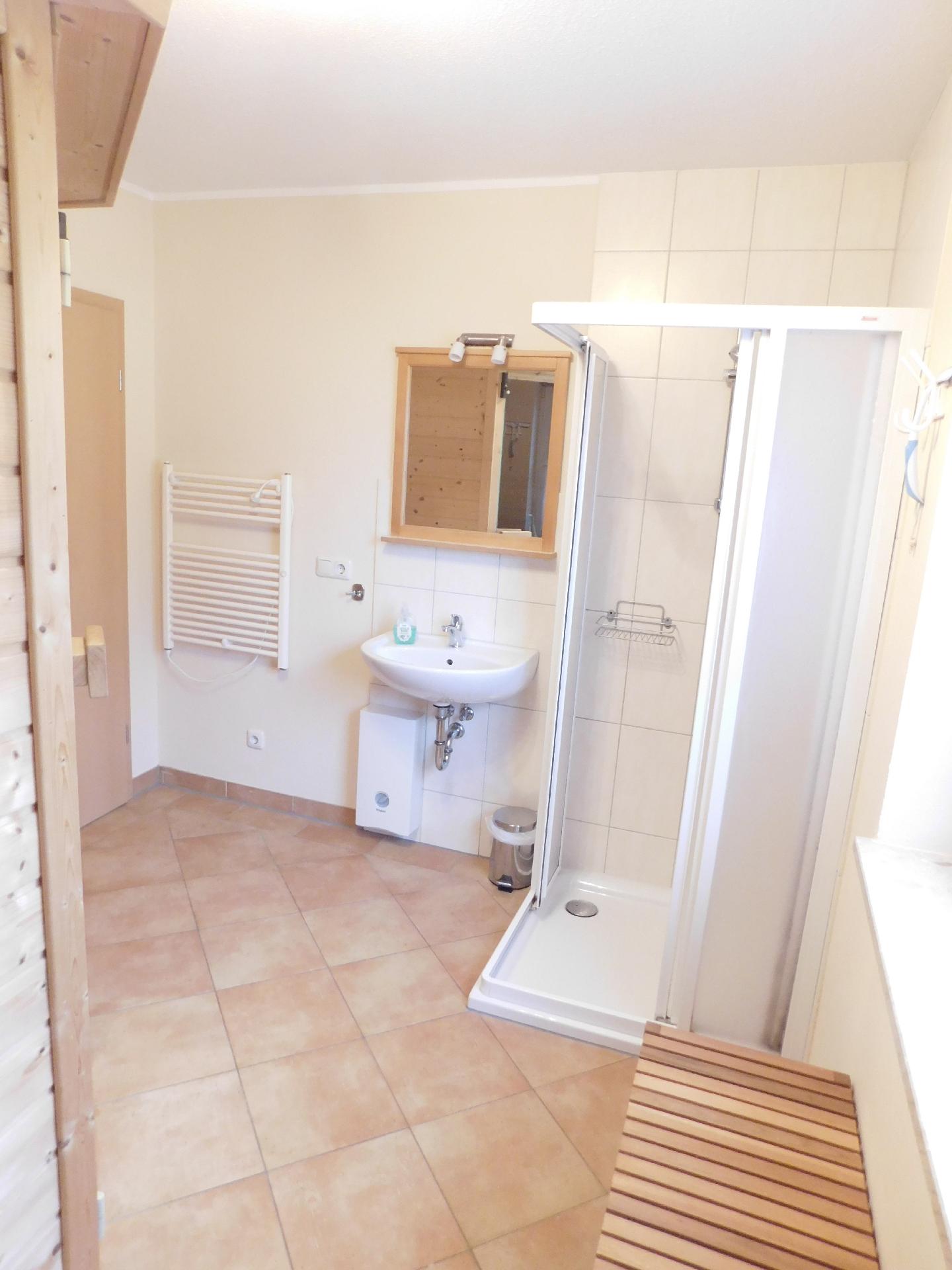 Im Badezimmer mit WC und Dusche, Föhn, Handtuchtrockner und Fußbodenheizung befindet sich die Sauna.