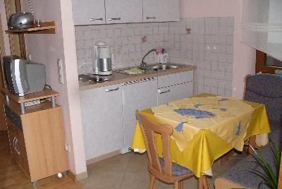 Die Ferienwohnung für 2 Personen verfügt über ein Wohnzimmer mit offener Küche, ein Schlafzimmer mit Doppelbett und ein Badezimmer (eine Aufbettung ist im Wohnzimmer auf der Schlafcouch auf Anfrage möglich). Die offene Miniküche ist voll ausgestattet mit Kühlschrank mit Gefrierfach, Kaffeemaschine, Wasserkocher und 2 Platten-Elektroherd sowie Koch- u. Eßgeschirr. Direkt neben der kleinen Küchezeile können Sie auf der Eckbank mit Stuhl und Eßtisch Platz nehmen. Von der Eßecke aus schauen Sie in das Wohnzimmer mit Ecksofa, Stehlampe, Sat.-TV, Radio und CD-Player. Das Doppelbett bietet eine Größe von 1,60m x 2,00m. Ihr Badezimmer ist mit Dusche und WC ausgestattet. Es besteht Elektroheizung, Heizkörper sind in jedem Raum zu finden.