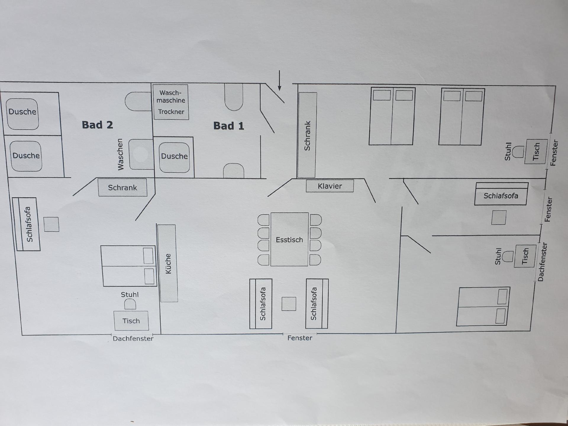 Schlafmöglichkeiten: Anzahl Doppelbetten (von 1,31 m bis 1,50 m Breite): 4; Anzahl Doppelbett (von 1,51 m bis 1,79 m Breite): 1