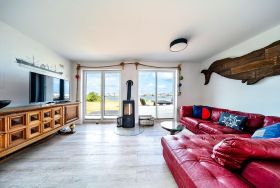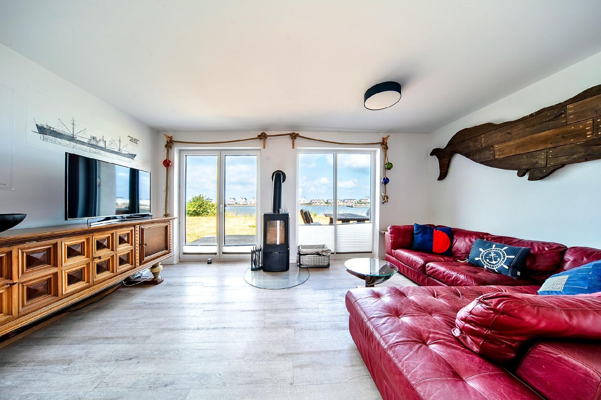 Der offene Wohn- und Essbereich im Erdgeschoss des Ferienhauses bietet Ihnen einen herrlichen Blick auf den Segel- und Sportboothafen des Ostseeresorts Olpenitz. Die bodentiefen Fenster lassen viel Licht herein und schaffen eine lichtdurchflutete Atmosphäre, die zum Verweilen einlädt. Nehmen Sie Platz auf dem roten Echtledersofa und lassen Sie sich von den Seemannsdetails umgeben, die für eine gemütliche und maritime Atmosphäre sorgen.
