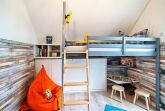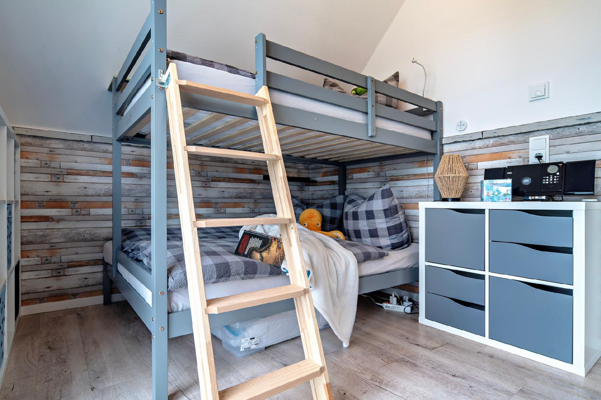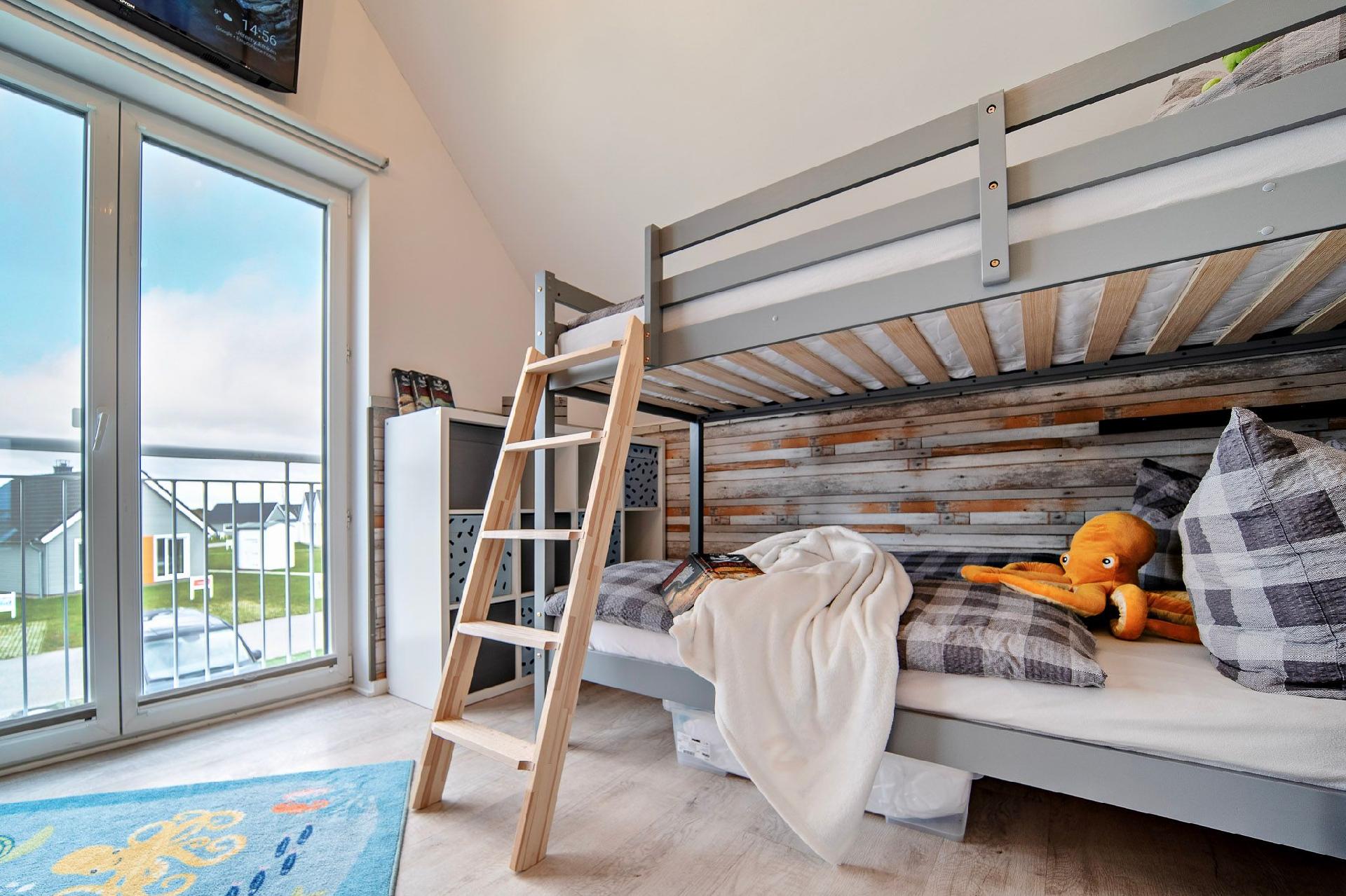 Im Obergeschoss des Ferienhauses finden Sie zwei Schlafzimmer vor, die zum Träumen einladen. Der Masterbedroom verwöhnt Sie mit einem komfortablen Doppelbett und einem atemberaubenden, direkten Wasserblick. Mit einem CD Player für Ihre Lieblingsmusik beginnen Sie den Tag. Das zweite Schlafzimmer verfügt über zwei Einzelbetten, die bei Bedarf auch zu einem Doppelbett umfunktioniert werden können, sowie ein hochwertiges Schrankbett.