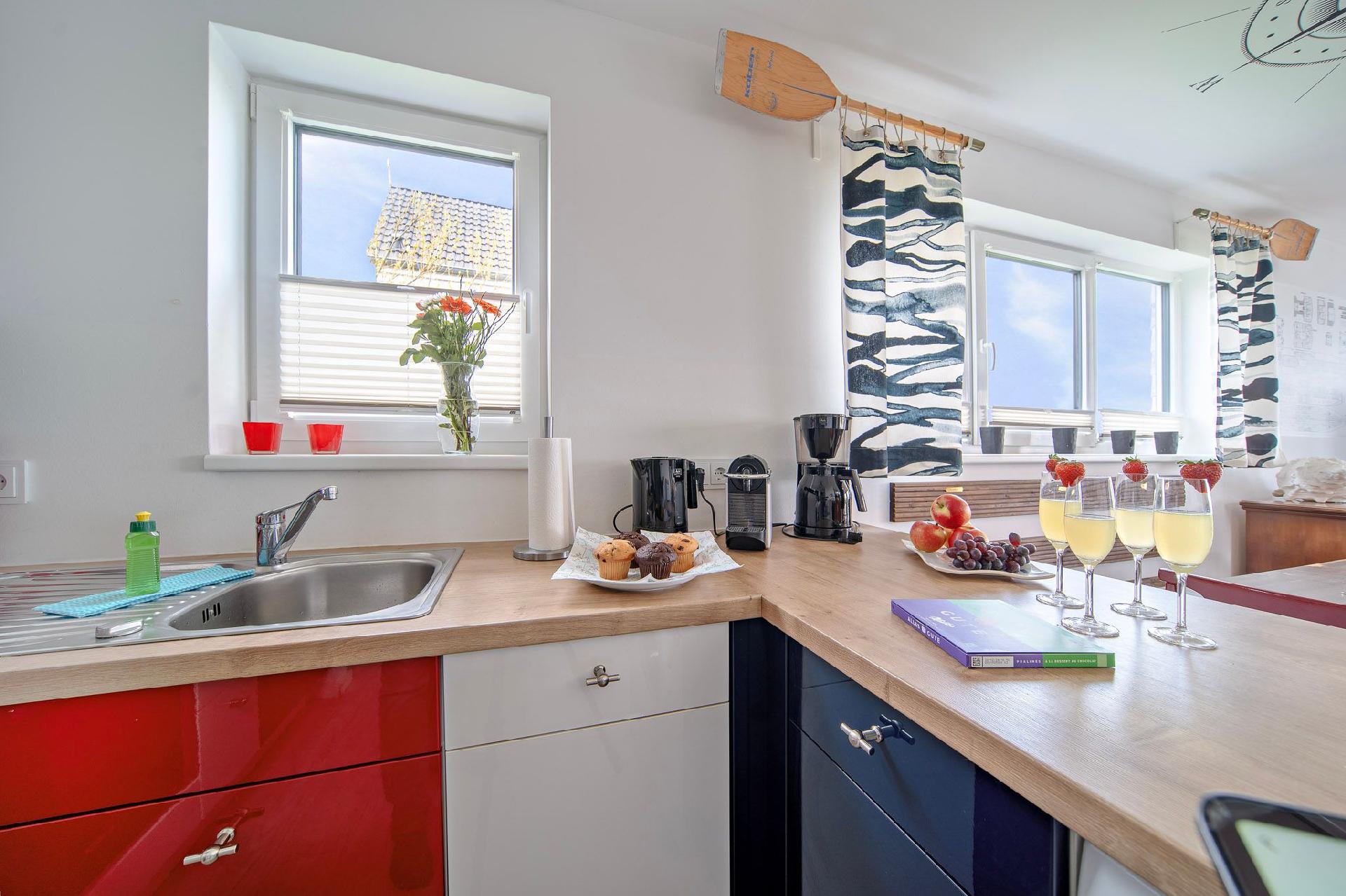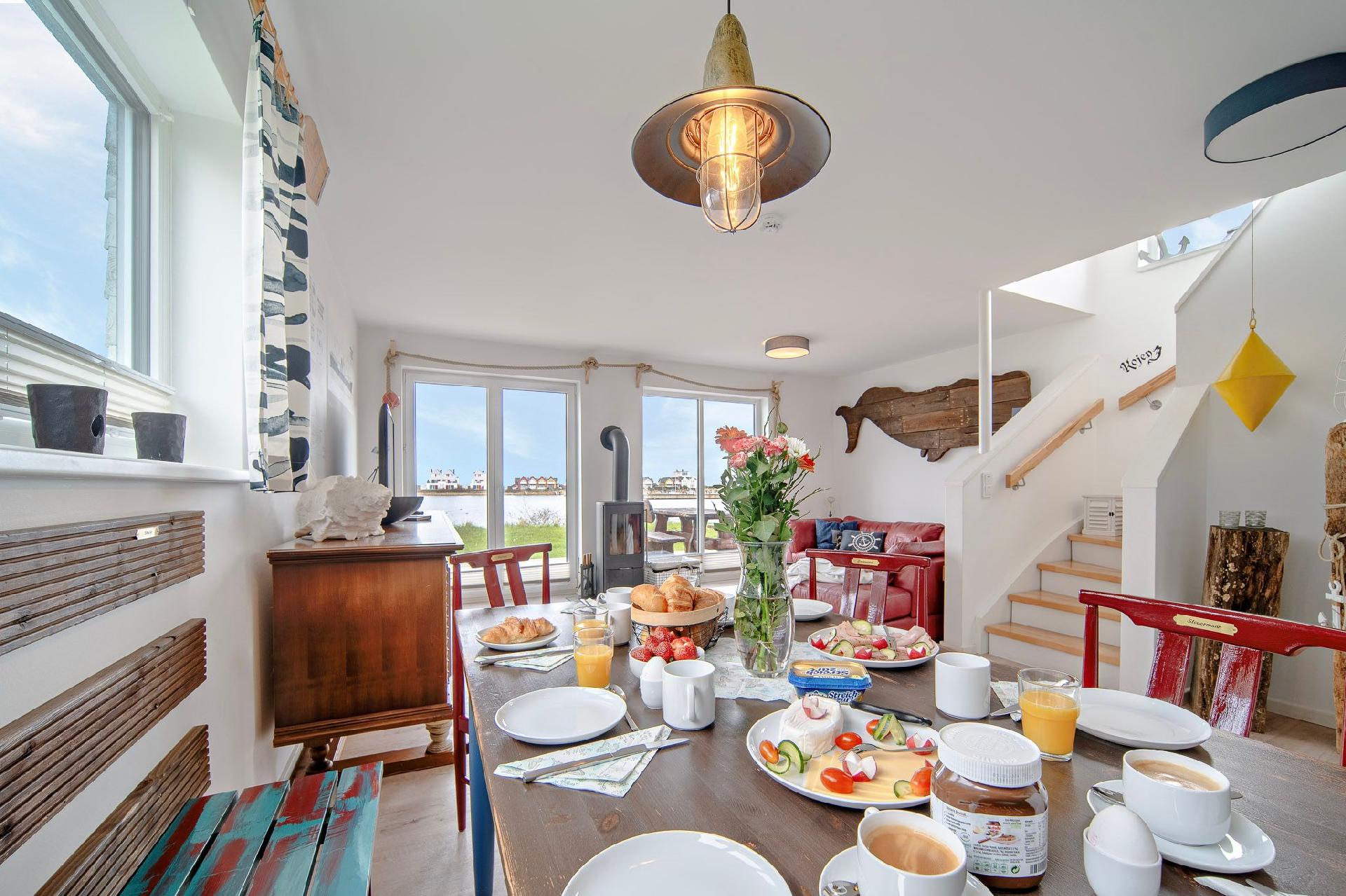 In der farbenfrohen und vollausgestatteten Küche können Sie gemeinsam mit Ihren Liebsten köstliche Mahlzeiten zubereiten und dabei den Blick auf das Wasser genießen. Lassen Sie sich von der inspirierenden Umgebung zu kulinarischen Kreationen hinreisen und verbringen Sie genussvolle Stunden am Esszimmertisch.
