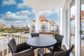 Entspannte und sonnige Stunden mit seitlichem Blick auf die Ostsee verbringt ihr auf dem überdachten und mit Gartenmöbeln ausgestatteten Balkon in Süd-West-Lage. Der Balkon ist vom Wohnbereich aus zugänglich.