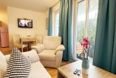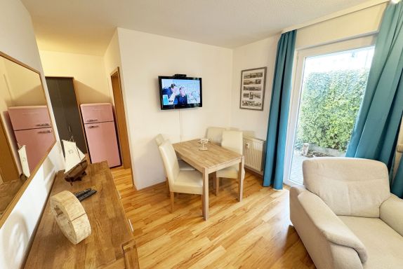 Die helle und komfortabel im Maritimen Stil eingerichtete Nichtraucherferienwohnung erreichen Sie im Erdgeschoss der Villa Linde. Mit ca. 50m² bietet sie Ihnen ausreichend Platz für max. 2 Personen. Sie betreten Ihre Wohnung über einen geräumigen Flur, in dem sich ein großer Kleiderschrank befindet. Wo sie zudem auch auf einen Wäscheständer, ein Bügelbrett und ein Bügeleisen zurückgreifen können. Der helle Wohn-/Essbereich öffnet sich mit bodentiefen Fenstertüren zu Ihrer bestuhlten Terrasse (S/W). Hier können sie ungestört Frühstücken oder laue Sommerabende ausklingen lassen. Eine bequeme Eck-Couch mit einem Couchtisch, einer Stehlampe, einem Sessel, einem Sideboard mit Flachbild-TV, einem DAB-Radio, einem WLAN-Zugang und ein Essplatz runden den Raum ab. Fast schon eine Besonderheit ist die separate Küche, welche mit einem Retro-Kühlschrank mit Eisfach, einem Backofen, einer Spülmaschine, einem Cerankochfeld, einer Mikrowelle, einer Kaffeemaschine, einem Toaster, einem Wasserkocher, einem Mixer, einem Pürierstab und weiteren Küchenutensilien ausgestattet ist. Im gemütlich eingerichteten Schlafzimmer erwartet Sie ein Boxspringbett (1,80m x 2,00m), Nachttischablagen, eine Verdunklungsmöglichkeit sowie ein Insektenschutz welche für einen ruhigen Schlaf dienen. Das innenliegende Badezimmer wurde mit einen Waschplatz, einem WC, einem Fön, einem Kosmetikspiegel, einer Dusche mit flachem Einstieg und als Highlight eine beleuchtete Massagedusche mit 6 Modi sowie mit Regen-, Wasserfallfunktion ausgestattet. 1 Hund ist mit seinem eigenen Schlafplatz ein gern gesehener Gast. Ihre mitgebrachten oder geliehenen Fahrräder können Sie im Gemeinschaftskeller unterstellen. Ein PKW-Stellplatz (Nr.23) steht Ihnen hinter dem Haus inklusive zur Verfügung. Die Erstausstattung eines Wäschepaketes (komplette Bettwäsche, 1 Duschhandtuch, 2 kleine Handtücher, 2 Geschirrhandtücher) können Sie bis 14 Tage vor Anreise gegen einen Aufpreis dazu buchen oder durch eigenes Ergänzen.