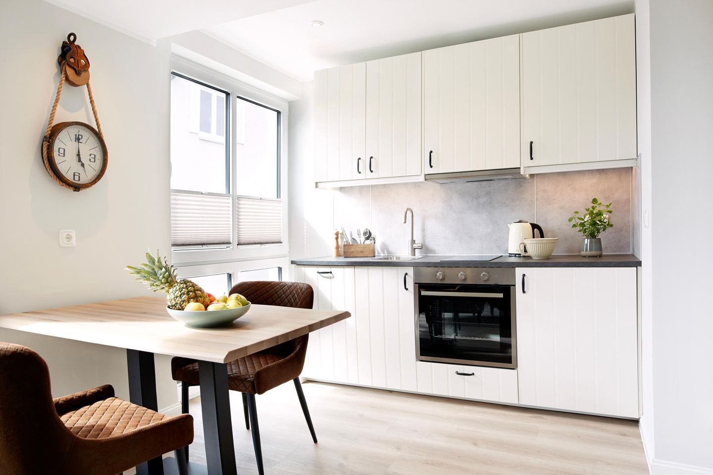 Die offene Küche ist komplett ausgestattet und lässt kaum Wünsche offen. Neben einem geräumigen Kühlschrank und einem Ceran-Herd finden Sie auch einen Backofen, eine Spülmaschine sowie sämtliche Küchenutensilien, die Sie für die Zubereitung eigener Mahlzeiten benötigen. Eine Kaffeemaschine und ein Wasserkocher stehen ebenfalls zur Verfügung, um Ihren Tag mit einem frisch gebrühten Kaffee zu beginnen. Das Esszimmer mit Esstisch und Stühlen ist der perfekte Ort, um gemeinsam zu speisen und den Aufenthalt zu genießen.