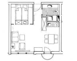 Ferienwohnung für 2 Personen im 1. Stock der Inselresidenz Strandburg. Ein großzügiges Studio mit moderner Einbauchküche inkl. Geschirrspülmaschine. Vor dem Essplatz können Sie die Balkontür weit öffnen zum Trittbalkon mit Blick auf die Strandstraße. Ein neues Duschbad ist ebenfalls vorhanden. Das Doppelbett ist räumlich getrennt vom Wohnbereich.