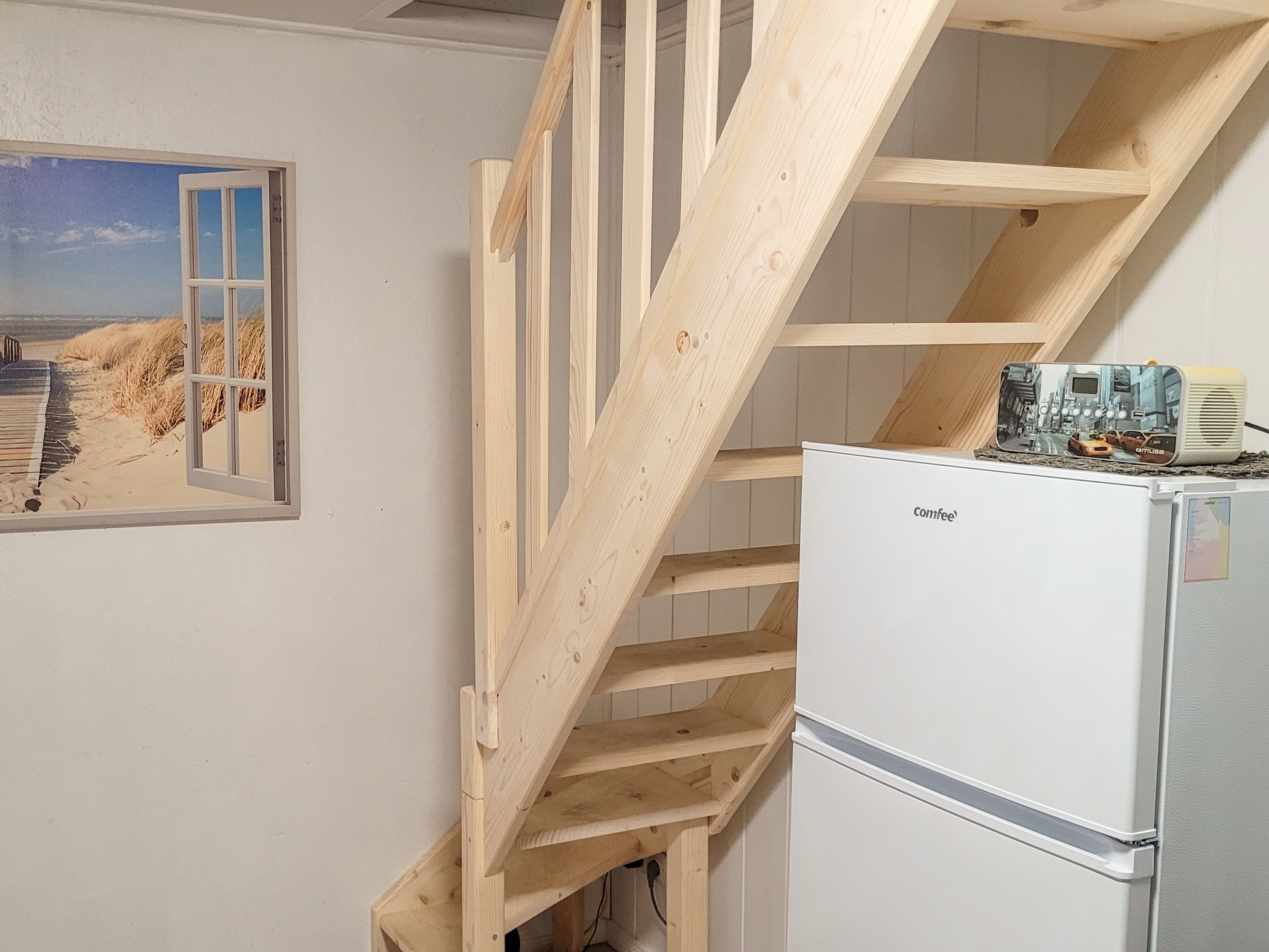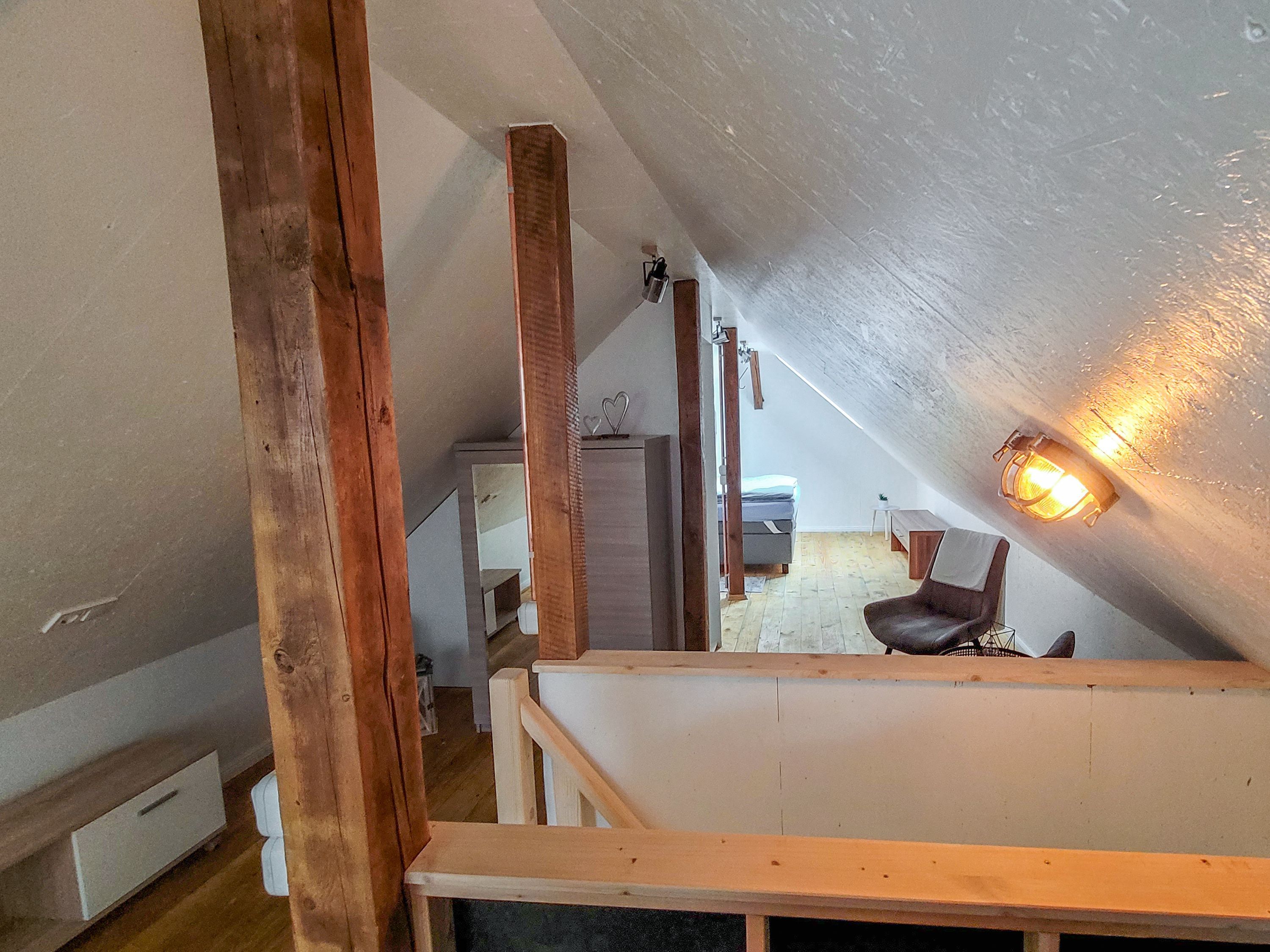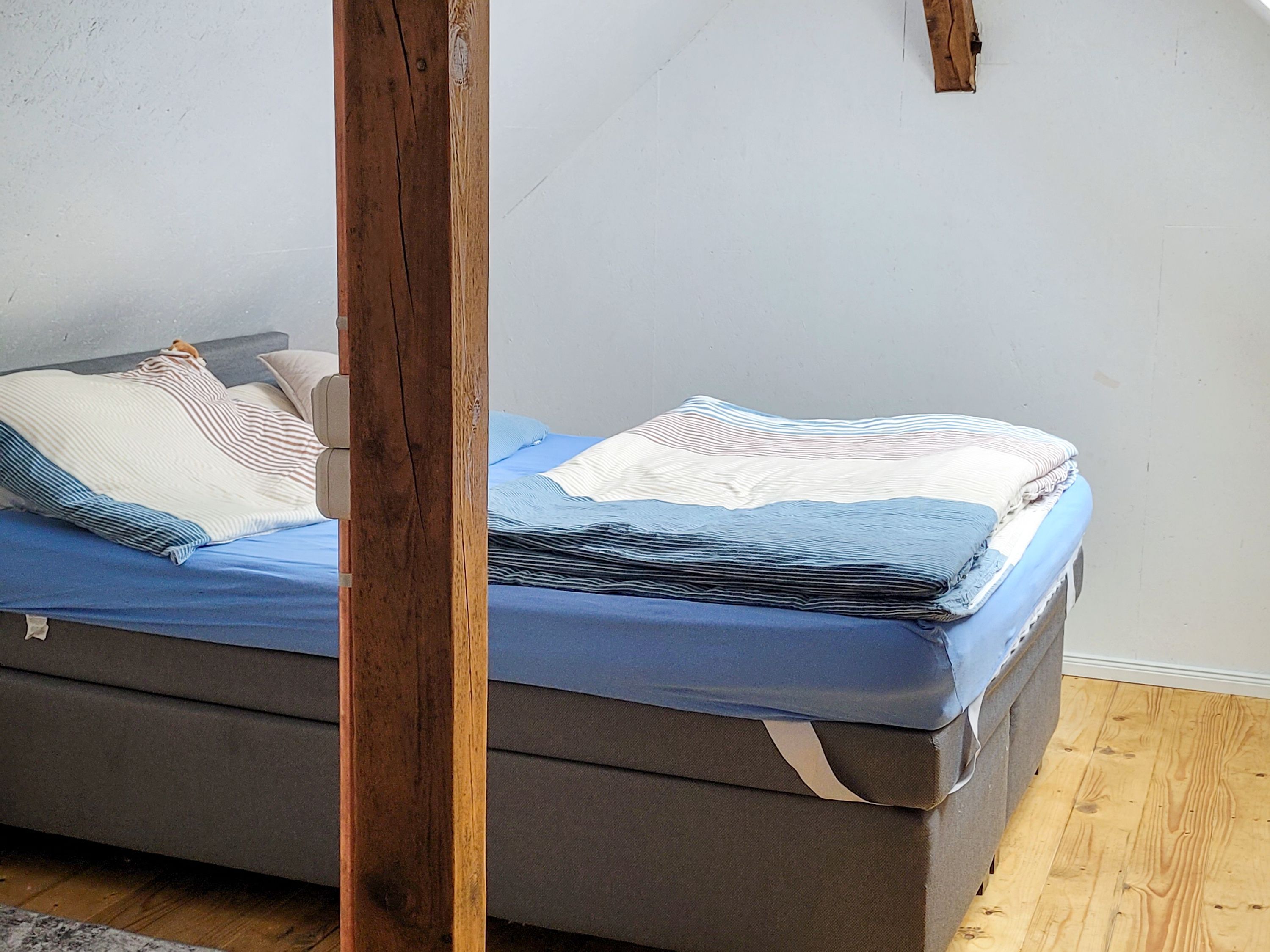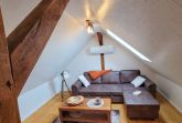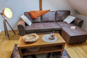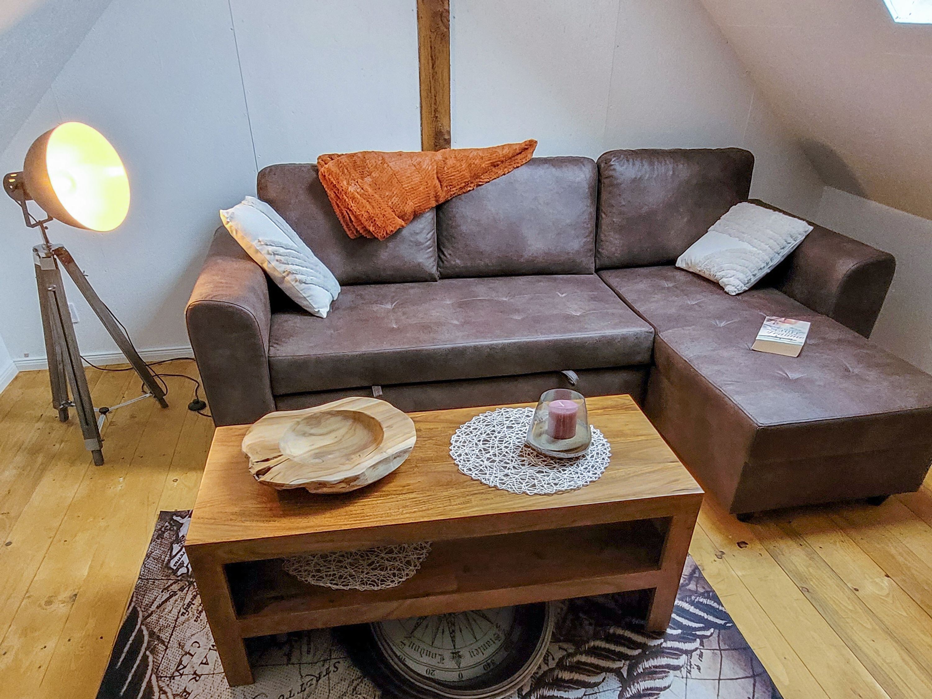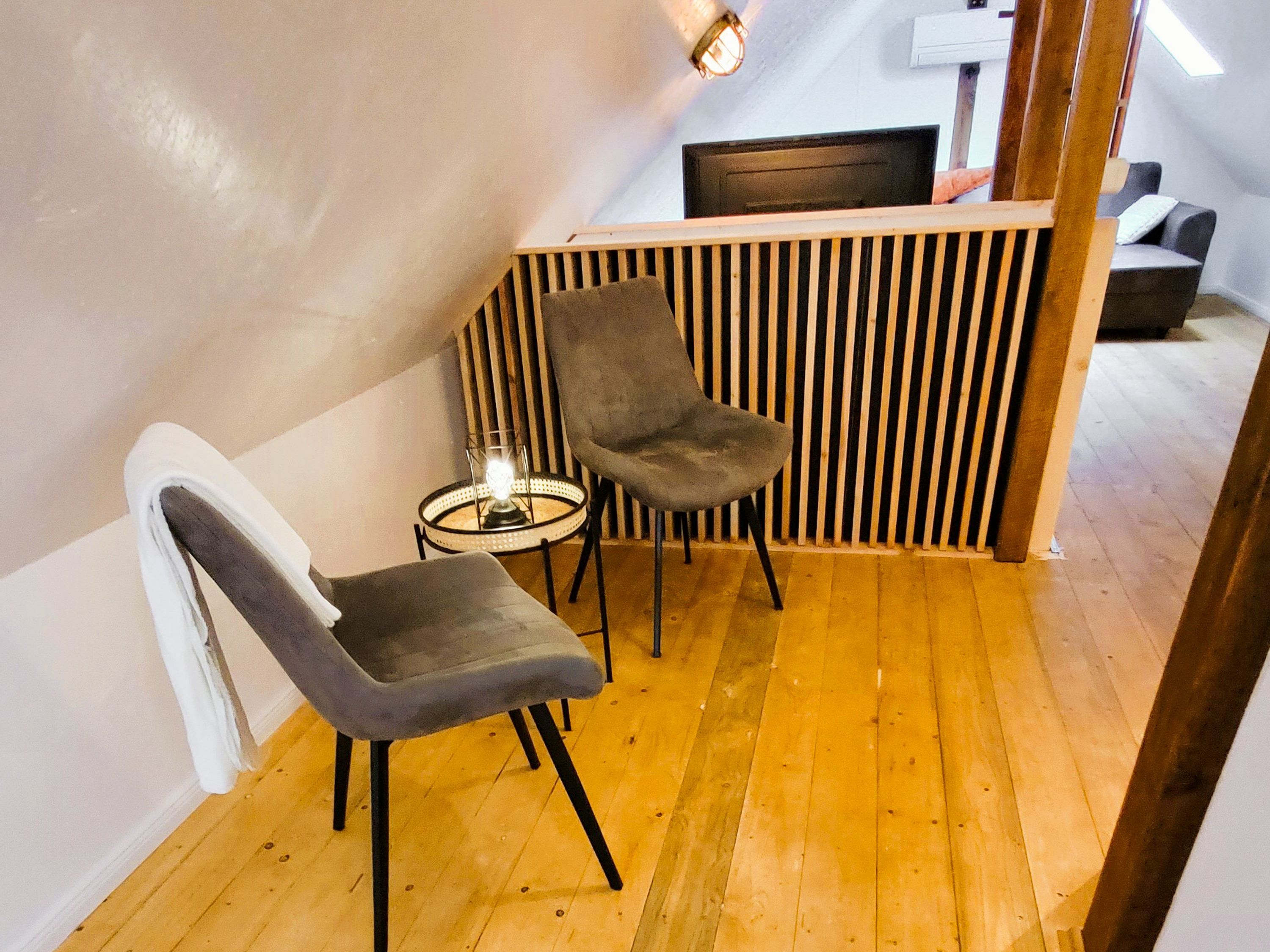 Boje 6 ist eine gemütliche Maisonettewohnung für bis zu 4 Personen, die dir auf zwei Etagen eine charmante Auszeit auf Usedom ermöglicht. Du betrittst die Wohnung über einen kleinen Flur mit Garderobe und Spiegel, von dem aus du in die separate Küche und das Badezimmer gelangst. Die Küche ist funktional ausgestattet mit Kochfeld, Kühlschrank, Pad-Kaffeemaschine, Wasserkocher, Toaster und allem, was du für den kleinen oder großen Hunger brauchst. Am Esstisch kannst du in aller Ruhe frühstücken, den Tag planen oder den Abend bei einem Glas Wein ausklingen lassen. Über eine Treppe gelangst du in das offen geschnittene Dachgeschoss, das durch seine Holzbalken, Schrägen und liebevolle Gestaltung eine besonders einladende Atmosphäre schafft. Im vorderen Teil befindet sich eine gemütliche Sitzecke mit Schlafsofa (140x200) und TV – perfekt zum Lesen, Entspannen oder als zusätzliche Schlafmöglichkeit. Im hinteren Bereich steht ein Doppelbett (140x200), das dir ruhige Nächte in behaglicher Atmosphäre verspricht. Ein Kleiderschrank bietet ausreichend Stauraum für deine Urlaubsgarderobe. Das helle Bad ist mit einer Dusche und einem WC ausgestattet und bietet dir alles, was du für deine tägliche Wohlfühlroutine brauchst. Draußen erwartet dich eine kleine Terrasse mit Sitzgelegenheit, die perfekt für einen Kaffee in der Morgensonne oder einen entspannten Grillabend geeignet ist. Ein Parkplatz sowie Fahrradständer stehen dir direkt auf dem Grundstück zur Verfügung.