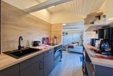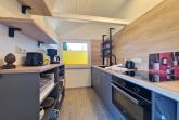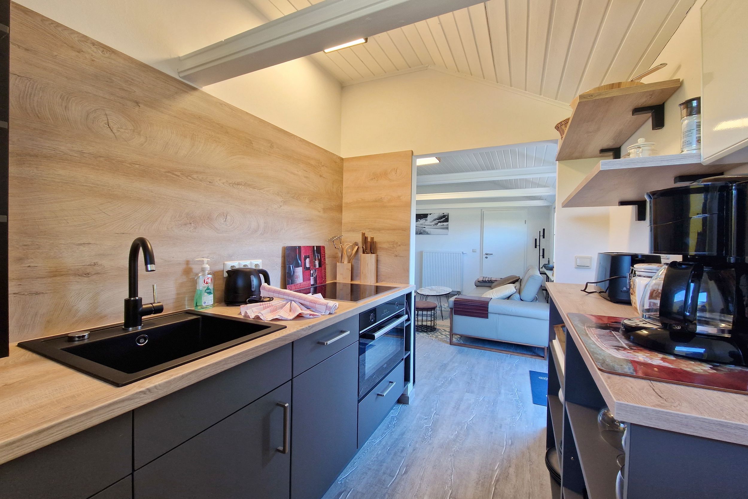 Die offene voll ausgestattete Küche verfügt über einen 4 -Felder Induktionsherd, Backofen, Kühlschrank mit Gefrierfach, Spülmaschine, Kaffeemaschine, Toaster, Wasserkocher und reichlich Küchenutensilien.