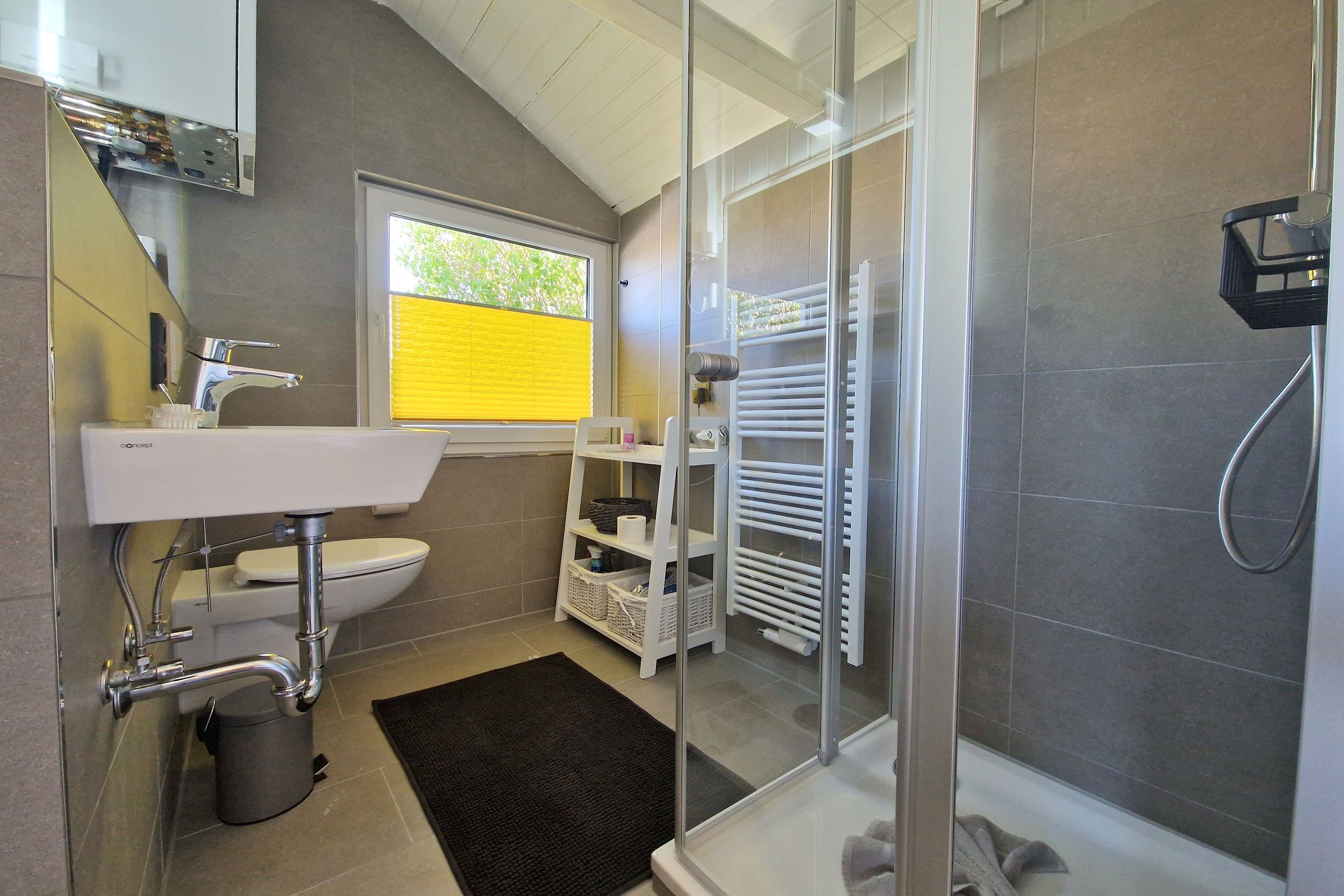 Das Tageslichtbad ist mit einer ebenerdigen Dusche und WC ausgestattet.