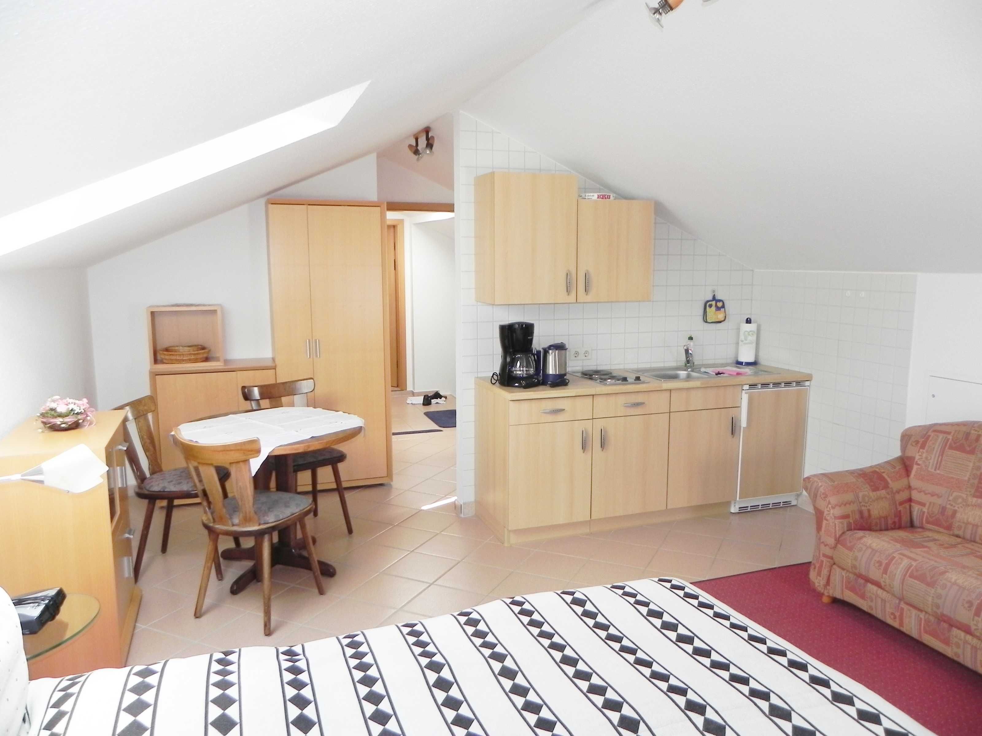 Die Wohnung in der Mansarde (drittes Obergeschoss) mit 35 qm Größe bietet Platz für 2 Personen. Die Wohnung verfügt über einen kombinierten Wohn-/Schlafraum mit einem Doppelbett, Kabel-TV, Sofa und einem Esspatz sowie eine gut ausgestattete Pantryküche. Bad mit Dusche und WC.