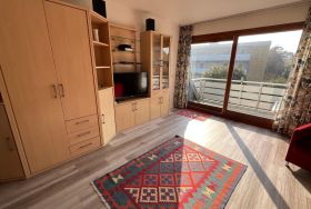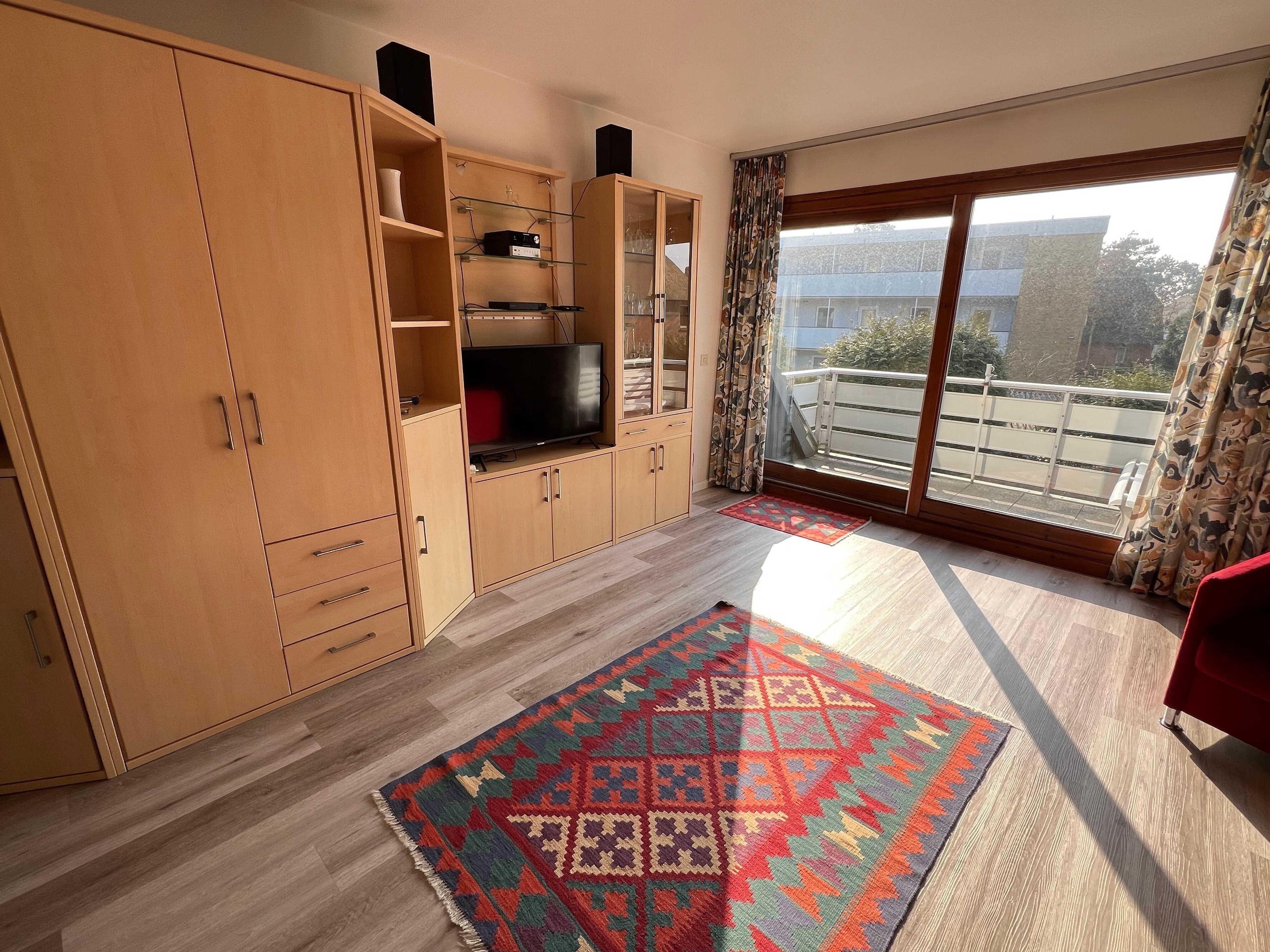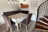 Der helle, großzügige Wohnraum (33 qm) ist mit einer Essecke, einem komfortablen (Schlaf-)Sofa für zwei und einer Schrankwand mit Sat-TV ausgestattet. Direkt vom Wohnraum gelangen Sie in die kleine komplett ausgestattete Küche mit Geschirrspüler. Eine Wendeltreppe führt ins Schlaf- bzw. Kinderzimmer (23 qm) mit Doppel-, Etagen- und Kinderbett. Im Duschbad befindet sich eine neue Waschmaschine. Der Balkon (4,5 qm) in sonniger Südlage lädt zum Essen oder Faulenzen ein. Das moderne Wohnzimmersofa lässt sich mit einem Handgriff zu einer vollwertigen Schlafcouch aufklappen.