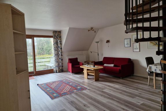 Die Ferienwohnung liegt im 1. OG und Dachgeschoss einer kleinen Anlage zurückgesetzt in zweiter Reihe, also ruhig und weit ab von der Straße.