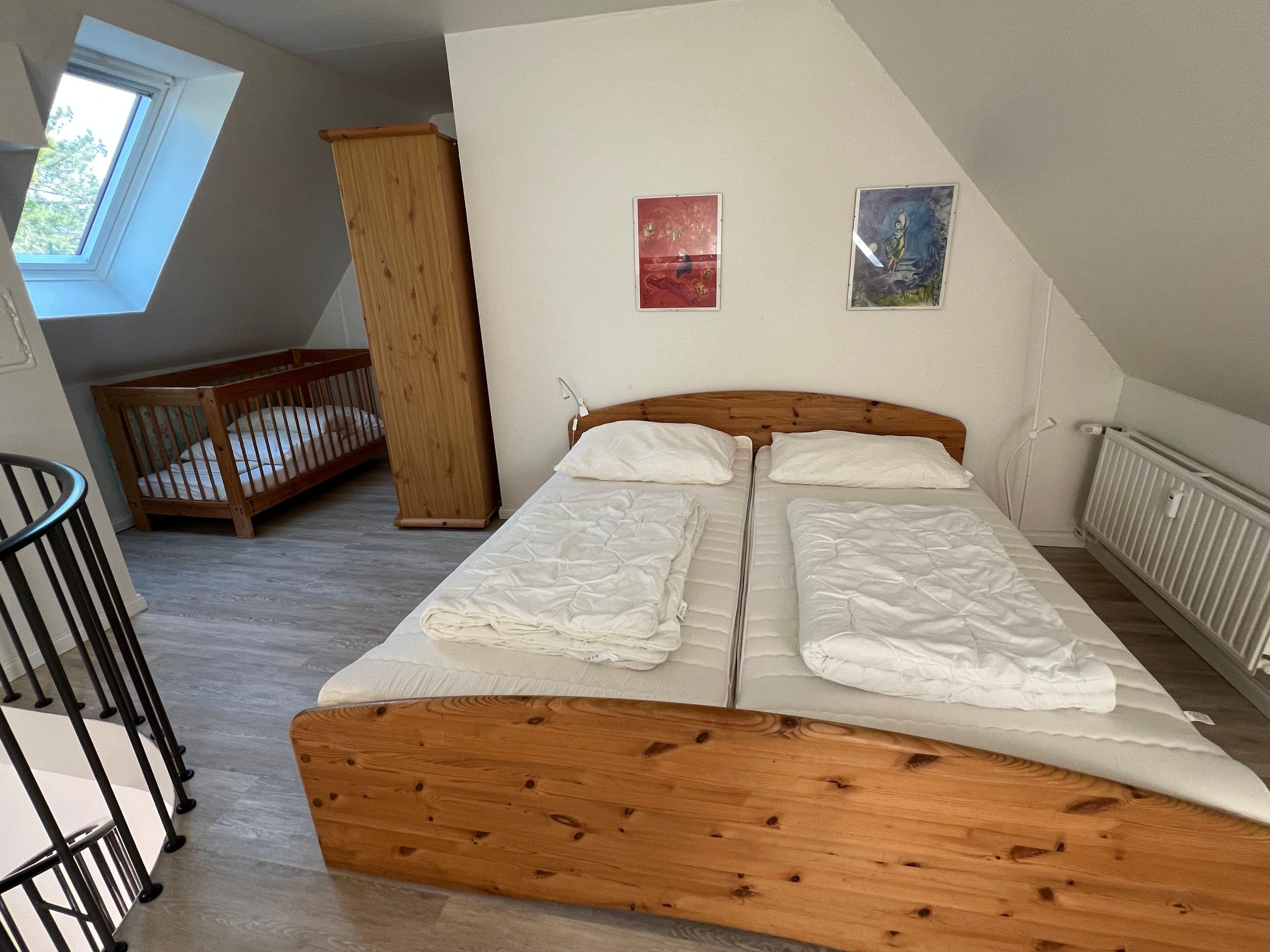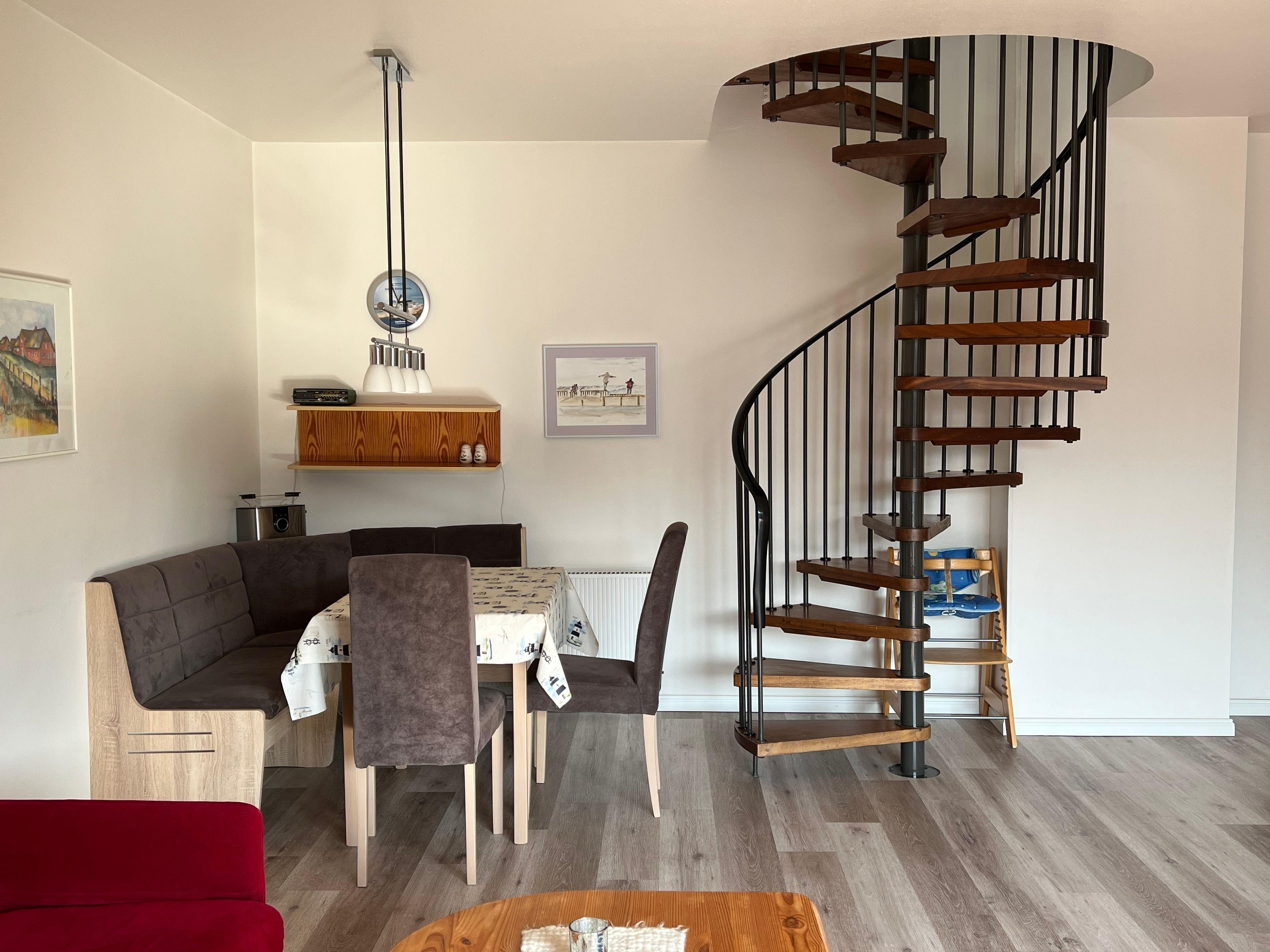 Bettwäsche und Handtücher sind mitzubringen. Zur Wohnung gehören zwei 7-Gang-Fahrräder die gern, bitte pfleglich und selbstverständlich auf eigene Gefahr, genutzt werden können. Wohn- und Schlafzimmer sind mit einer Wendeltreppe direkt (ohne Tür) verbunden, was wir als Familie mit 3 Kindern nie als Nachteil, eher als Vorteil empfunden haben.