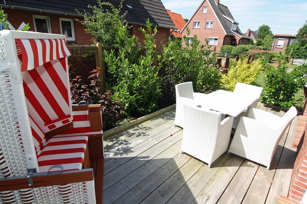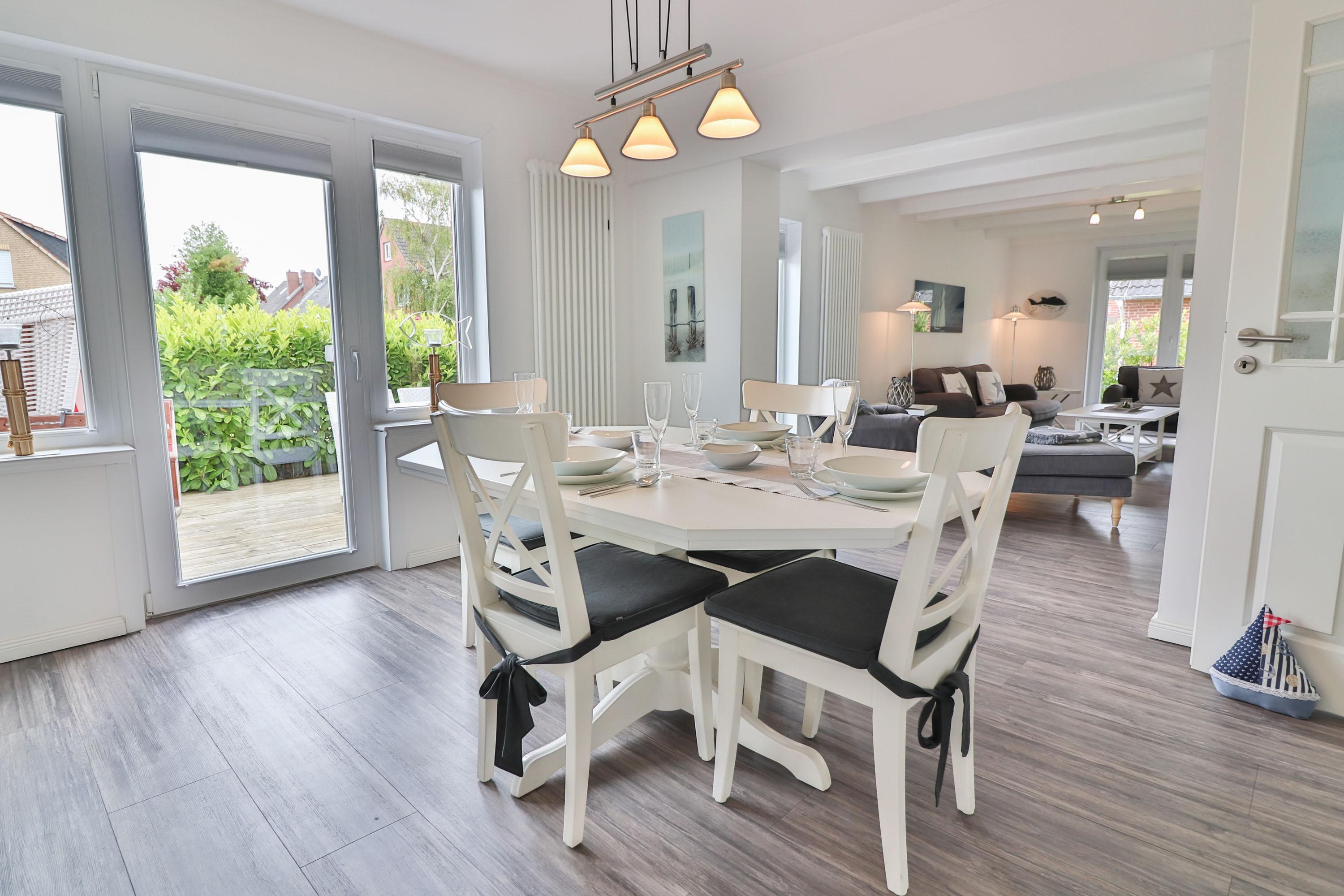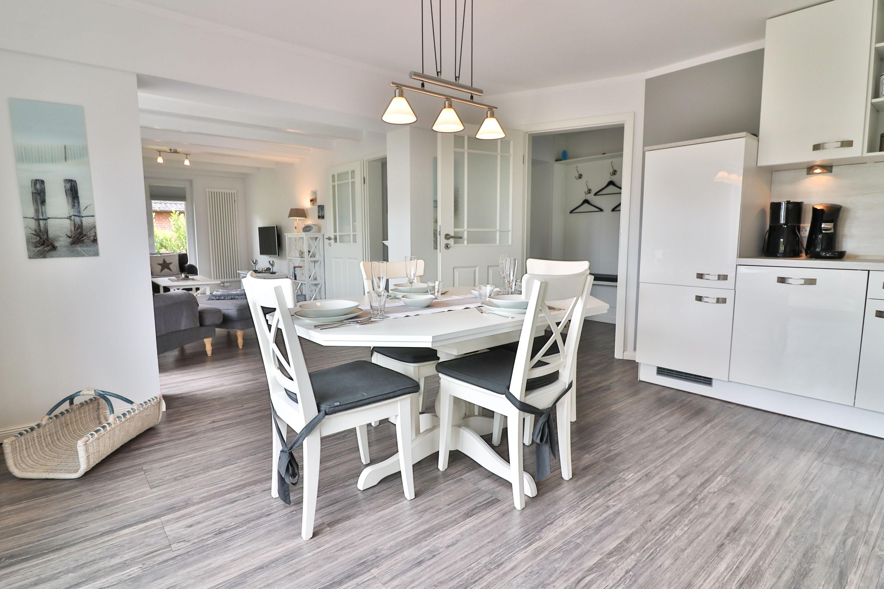 Das Ferienhaus verfügt über einen Wohnbereich, einen Essbereich mit Küche und großzügiger Außenterrasse und Strandkorb, sowie über ein separates Gäste-WC im Erdgeschoss.