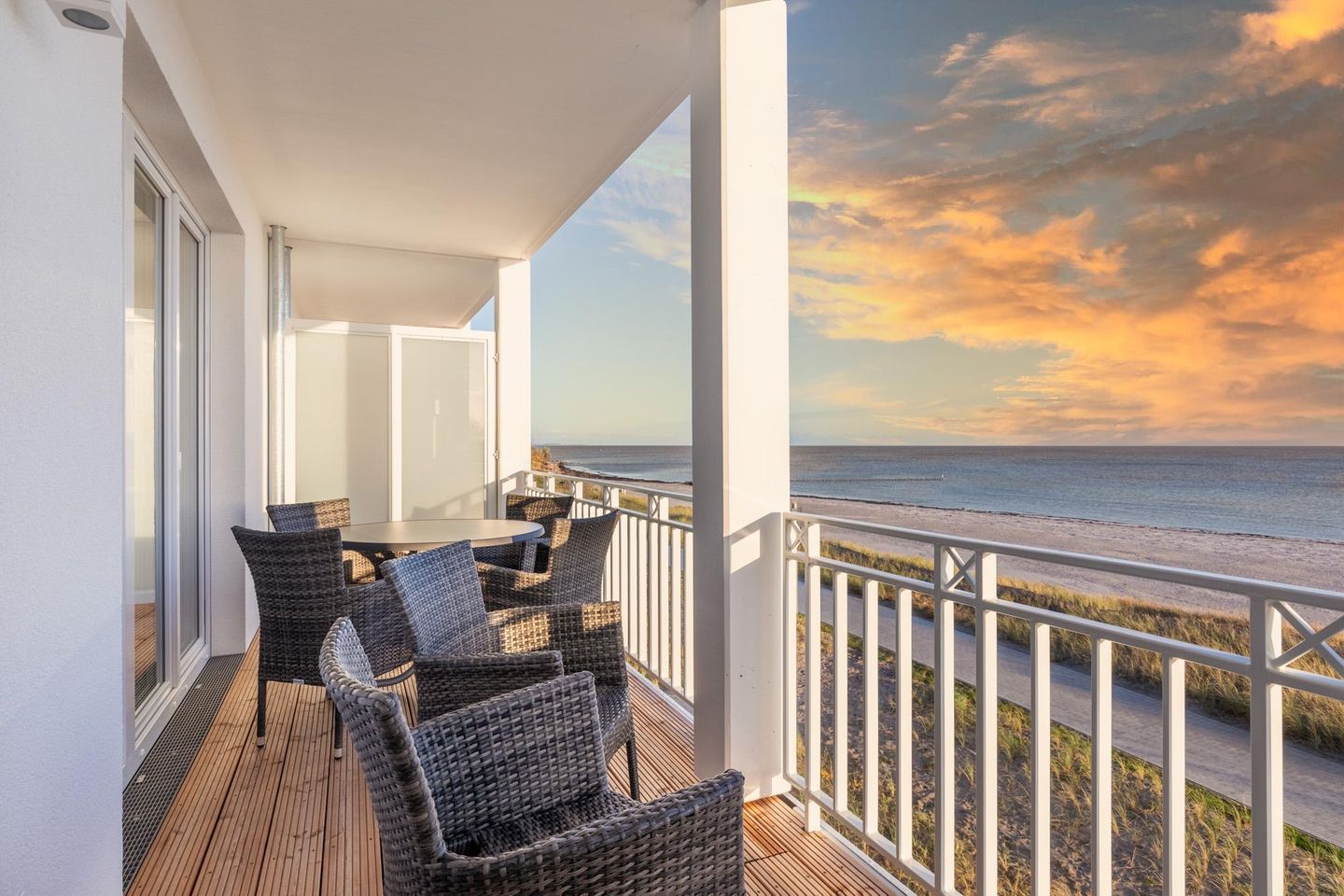 Entspannte und sonnige Stunden mit Panoramablick auf die See verbringt ihr auf dem großzügigen 10 qm großen Balkon in Süd-Ost-Lage. Der Balkon ist mit Gartenmöbeln ausgestattet und sowohl vom Wohnbereich als auch von einem der Schlafzimmer aus begehbar.