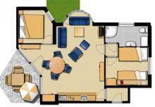 Alle Wohnungen haben getrennte Wohn-/Essbereiche, welche mit hellen Korb- und Holzmöbeln eingerichtet sind. In den Wohnungen gibt es Sat-TV, Radio, Telefon, Fön, E-Herd, Backofen oder Mikrowelle, Wasserkocher, Kaffeemaschine sowie teilweise eine Spülmaschine.