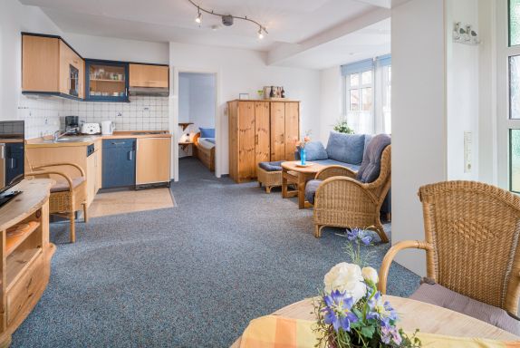 Alle Wohnungen haben getrennte Wohn-/Essbereiche, welche mit hellen Korb- und Holzmöbeln eingerichtet sind. In den Wohnungen gibt es Sat-TV, Radio, Telefon, Fön, E-Herd, Backofen oder Mikrowelle, Wasserkocher, Kaffeemaschine sowie teilweise eine Spülmaschine.