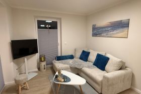 Flur, Schlafzimmer mit Boxspringbett (1,80 m x 2,00 m), eine offenen Wohnküche (Geschirrspüler und andere elektrische Küchengeräte vorhanden) mit Schlafsofa und TV und ein Duschbad mit ebenerdiger Dusche.