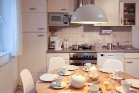 Das Appartement verfügt über drei Zimmer, davon zwei Schlafzimmer und ein geräumiges Wohn-/ Esszimmer mit voll ausgestatteter Küchenzeile (Herd inkl. Backofen, Spülmaschine, Kühlschrank mit separater Gefriereinheit, Mikrowelle).