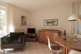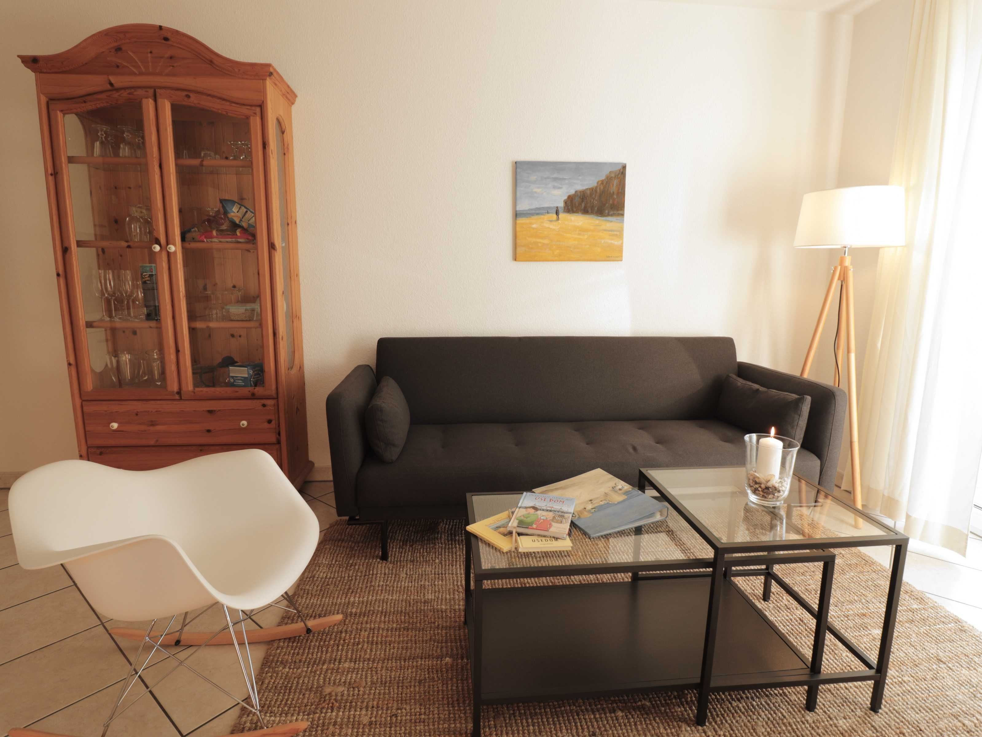 Die Sitzgruppe im Wohnzimmer bestehent aus einem Sofa und einem Sessel. Das Sofa kann bei Bedarf zum Schlafsofa ausgeklappt werden. An dem aus Massivholz gearbeiteten Esstisch haben mühelos bis zu acht Personen Platz . Des weiteren finden Sie im Wohnzimmer ein TV-Gerät mit Kabelanschluss, CD/DVD-Spieler sowie ein DAB/Internet Radio. Die Wohnung ist mit WLAN-Netz versorgt, das Gästen der Wohnung zur Verfügung steht. Für die kleine Langeweile zwischendurch, finden Sie in dem großen Sideboard eine Reihe ausgewählter Gesellschaftsspiele.