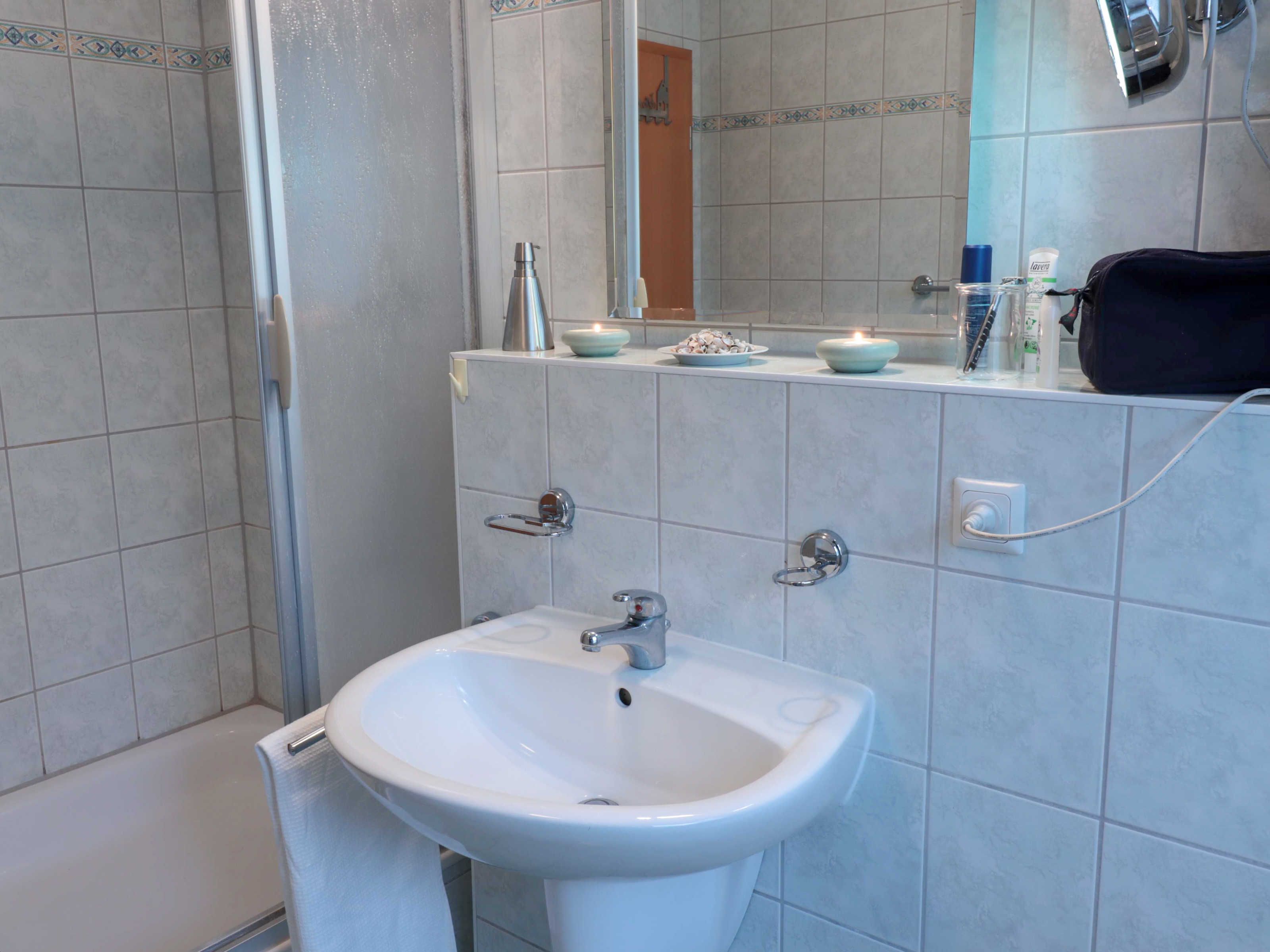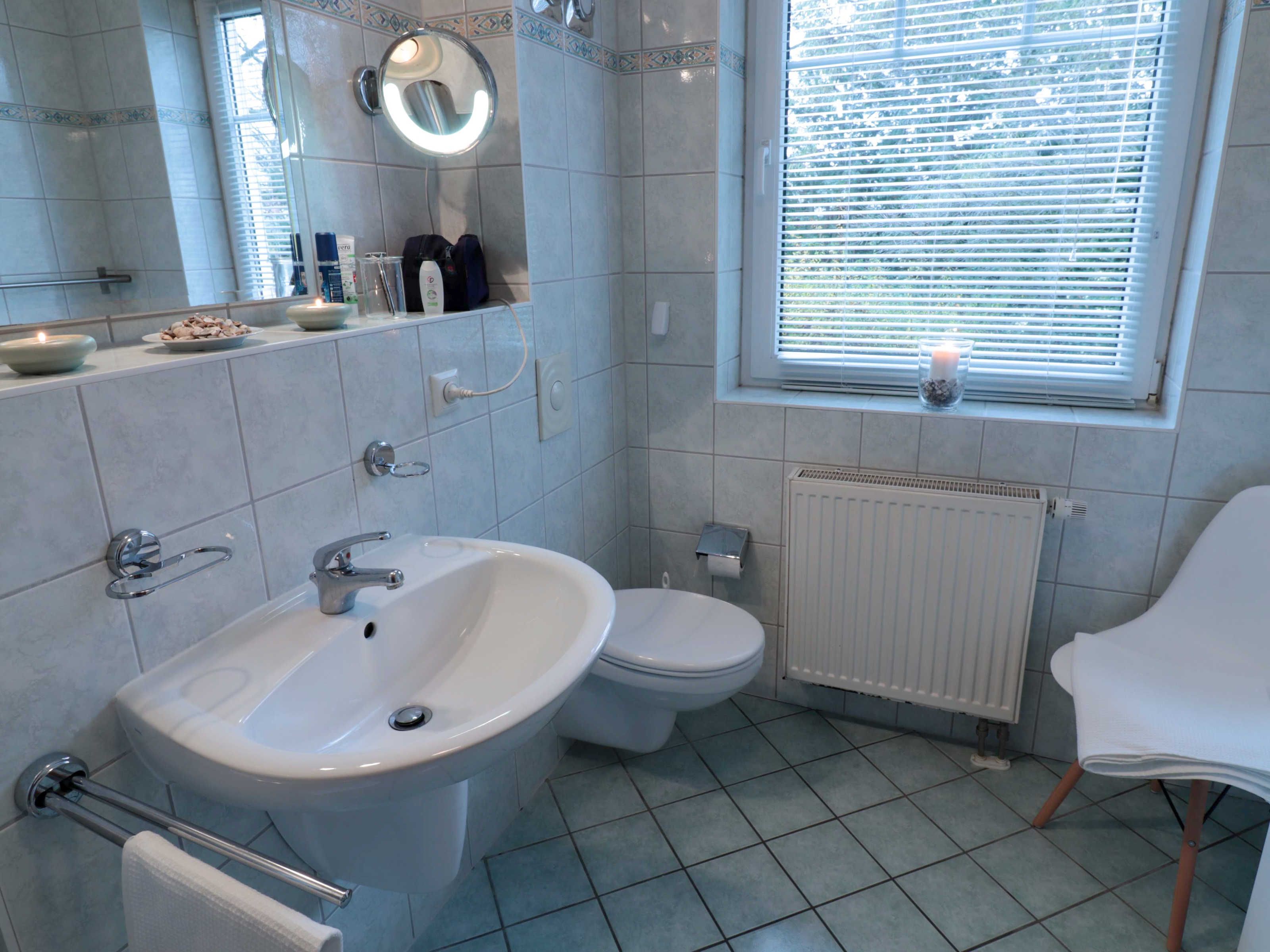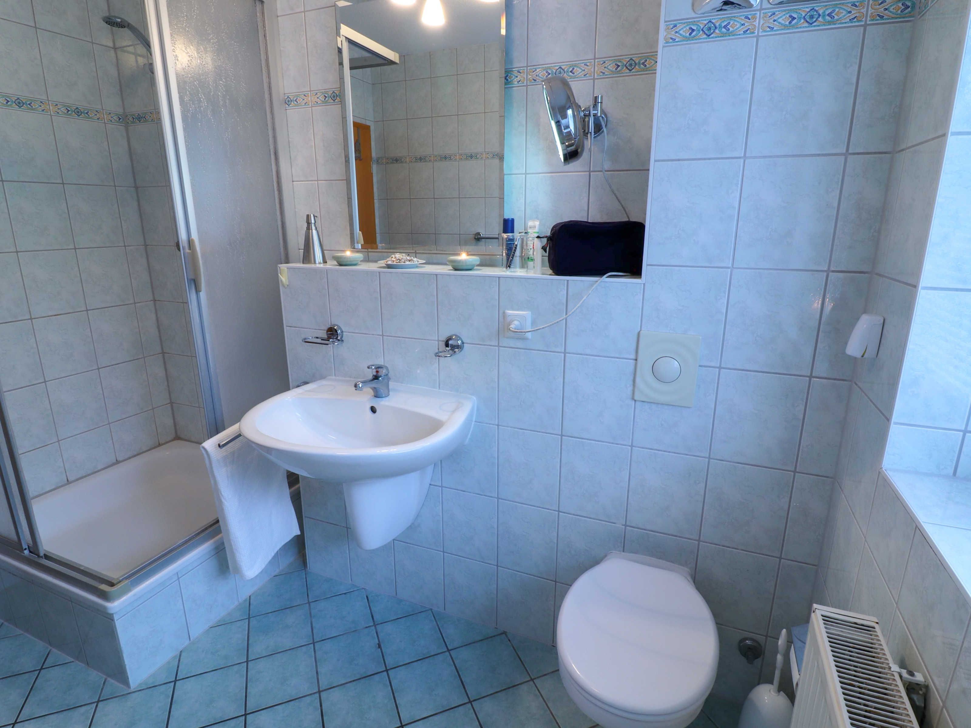 In dem tageslichtgefluteten Duschbad befindet sich ein Waschbecken, WC, eine geräumige Dusche sowie eine Waschmaschine.