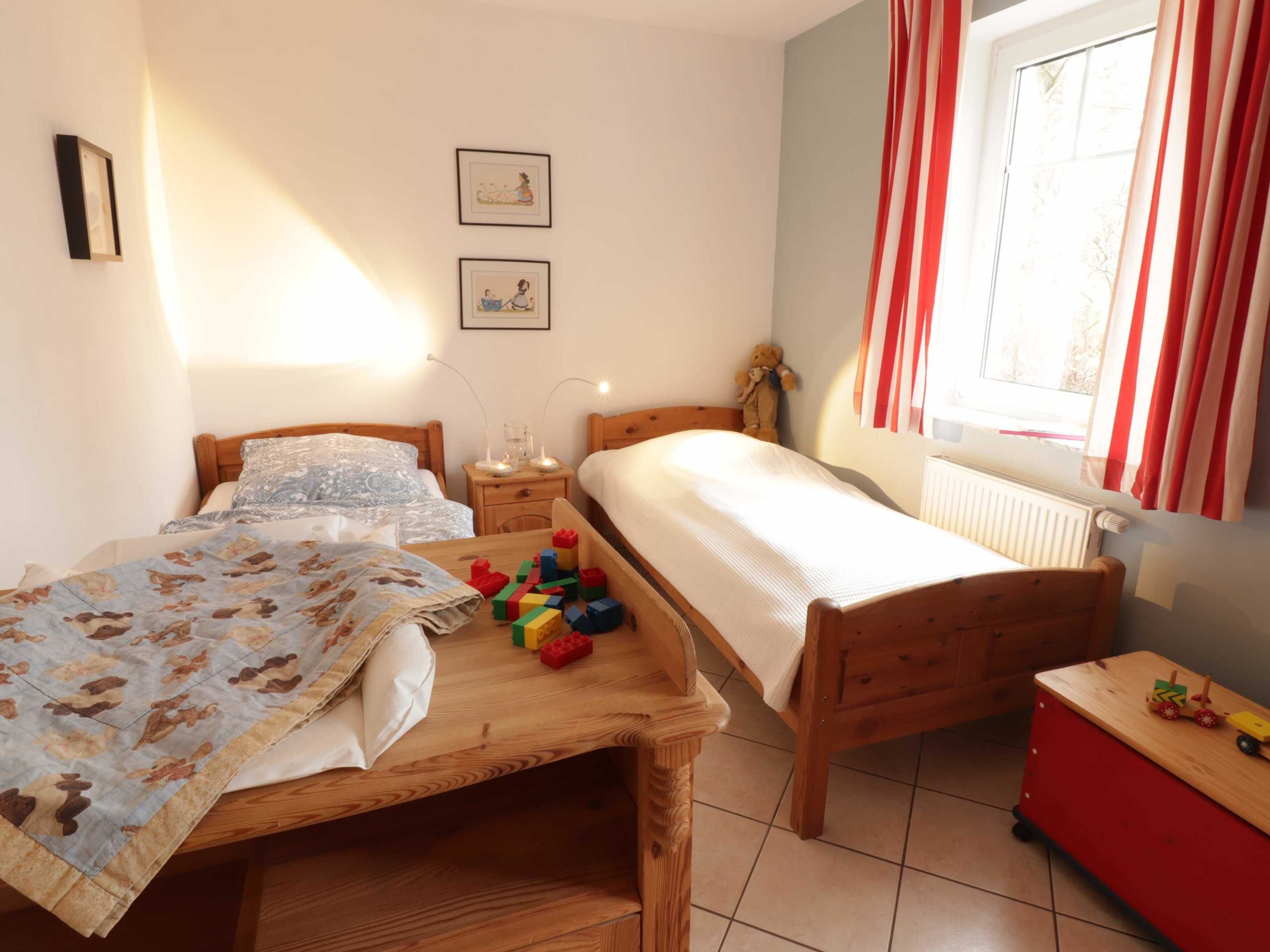 Im Kinderzimmer befinden sich zwei Einzelbetten (90 x 200 cm) und ein Kindergitterbett (70 x 140 cm). Dort sind auch ein großzügiger Kleiderschrank sowie eine Wickelkommode und eine Kinderspieltruhe mit Spielzeug untergebracht.