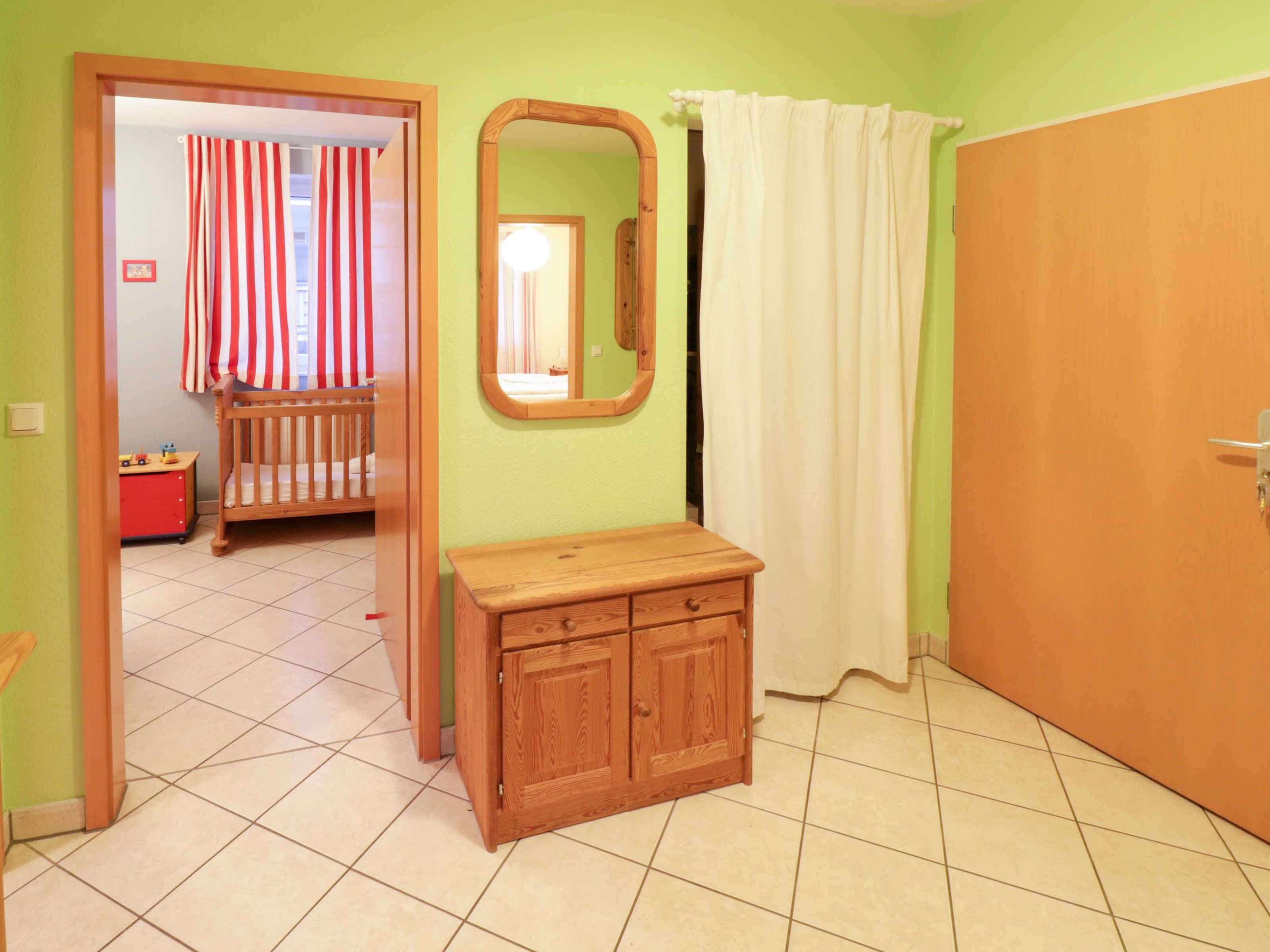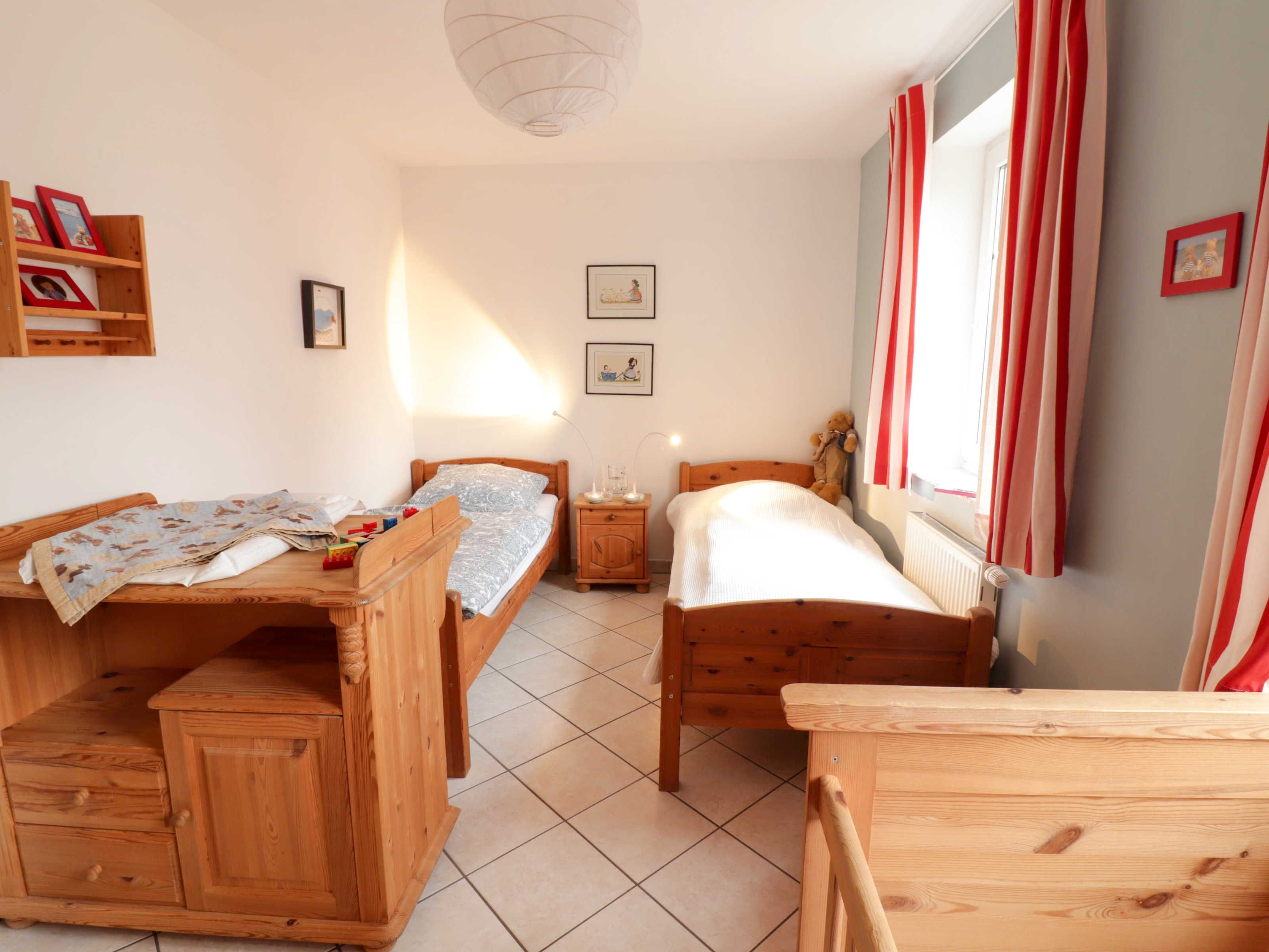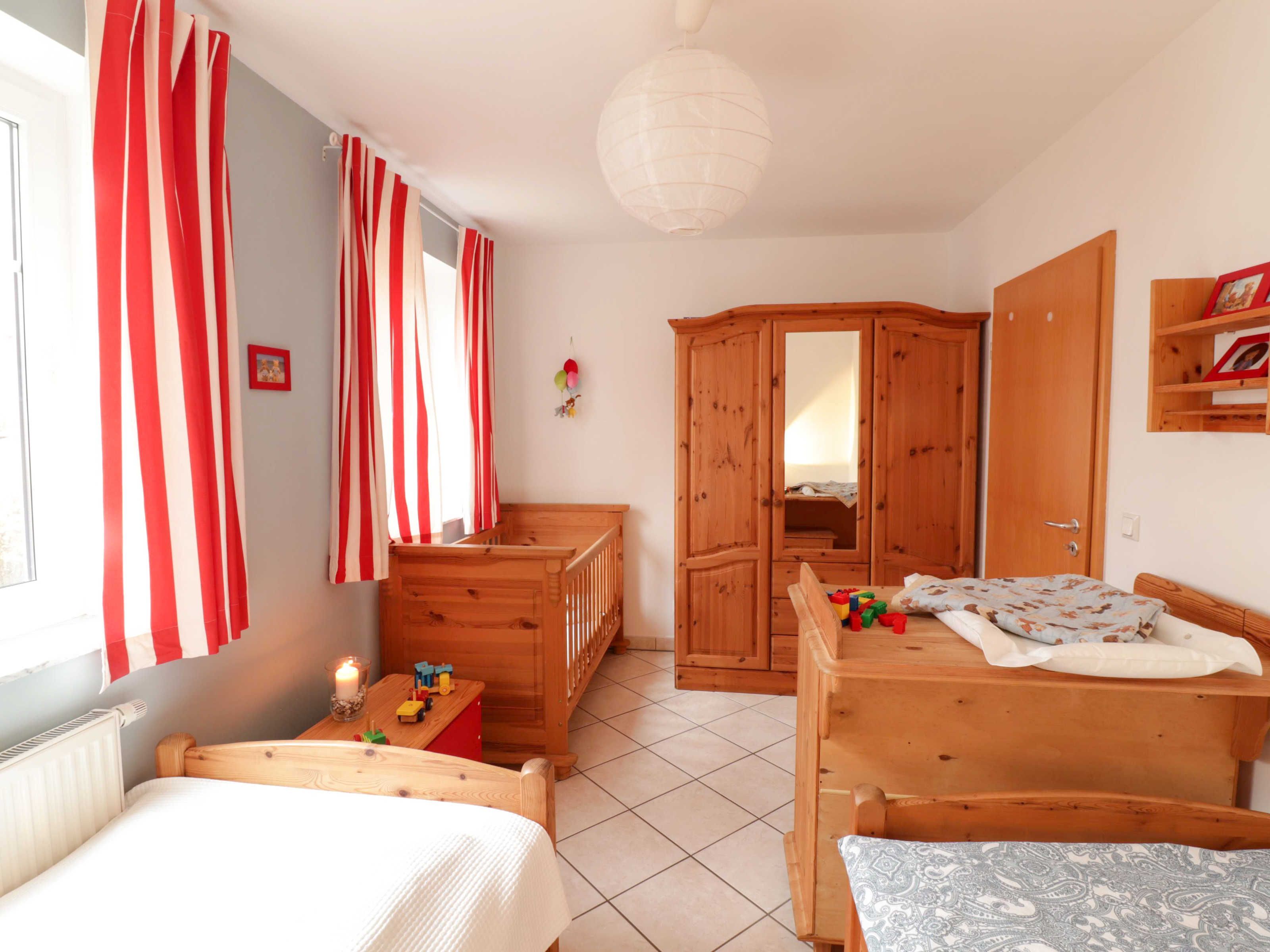 Im 2. Schlafzimmer befinden sich zwei Einzelbetten (90 x 200 cm) und ein Kindergitterbett (70 x 140 cm). Weiterhin finden Sie dort  auch einen großzügigen Kleiderschrank sowie eine Wickelkommode und eine Kinderspieltruhe.