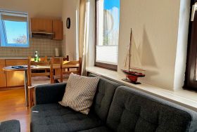 Diese Wohnung eignet sich für 2 - 3 Personen. Es gibt eine Wohnküche, ein Schlafzimmer mit Doppelbett, ein Einzelzimmer mit Schlafsofa 140x188cm, das durch das Schlafzimmer begehbar ist, sowie ein Badezimmer mit Dusche.