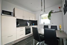 Diverse Einkaufsmöglichkeiten sind bequem zu Fuß erreichbar. Aufgrund der Lage werden Sie bereits beim Frühstück von der Sonne verwöhnt. Die Wohnung ist modern eingerichtet und lädt zum Verweilen und Wohlfühlen ein. Sie verfügt über einen hellen Koch- und Essbereich, der mit einer modernen Küchenzeile und einem Sitzbereich für 4 Personen eingerichtet ist. Die Küche ist gut ausgestattet und verfügt neben einer Spülmaschine, einer Mikrowelle, einem Wasserkocher und einer Kaffeemaschine zusätzlich über eine Senseo-Padmaschine, einen Eierkocher, Radio sowie weiterem Zubehör.