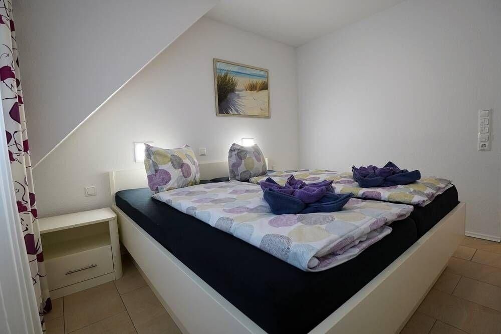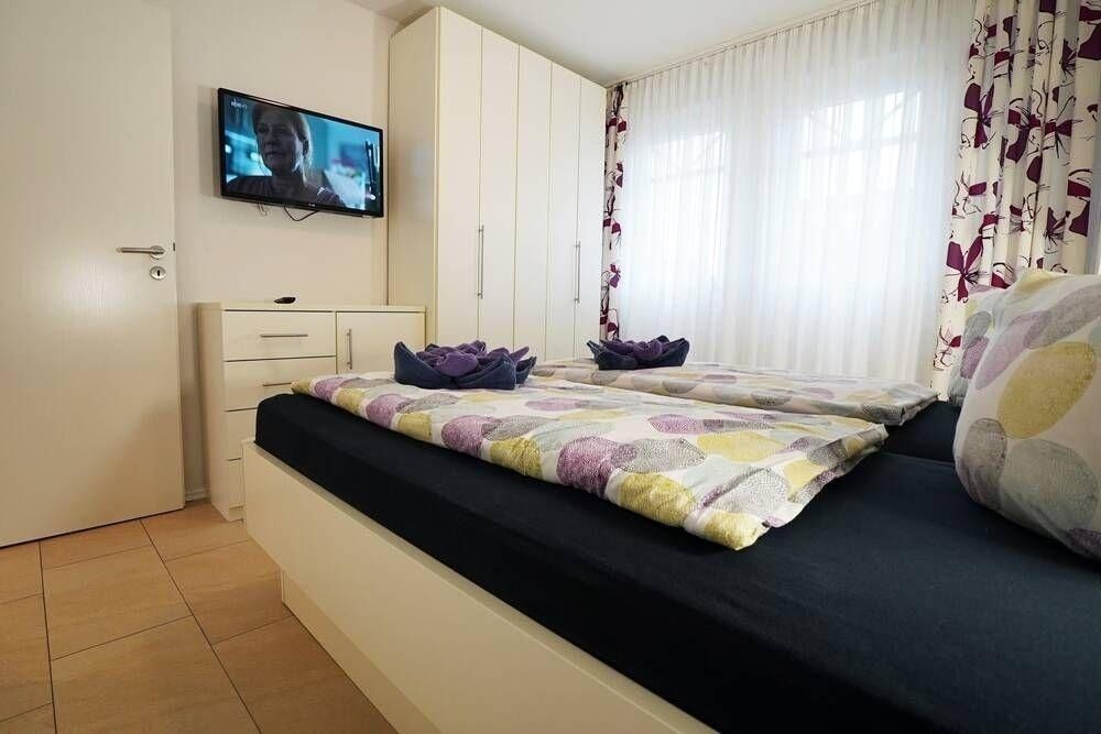 Im hellen Schlafzimmer finden Sie ein bequemes Doppelbett vor. Für weiteren Komfort sorgt ein geräumiger Kleiderschrank und eine Kommode.