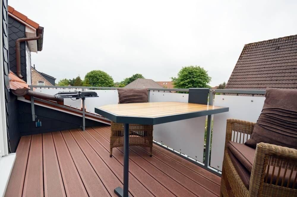 Auf dem mit Gartenmöbeln bestückten Balkon können Sie die letzten Sonnenstrahlen des Tages einfangen oder mit dem Elektrogrill eine leckere Mahlzeit genießen.