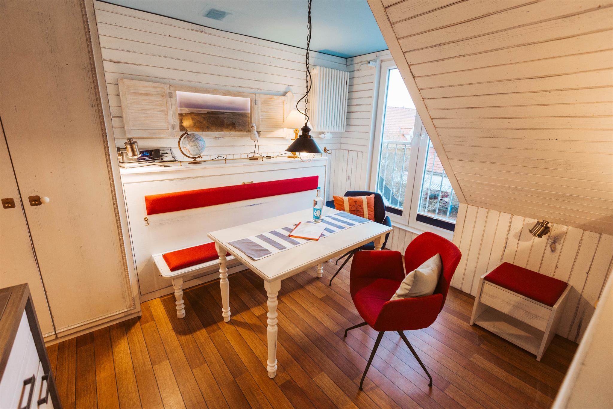 Motto: Stell dir vor, du strandest mit deinem Segelschiff am Strand und kommst nicht mehr weg dann baust dir dein Schiff zu einer gemütlichen kleinen Wohnung um - mit viel Holz, Bullaugen und allem möglichen, was man auf einem Schiff so hat - natürlich ohne den modernen Komfort zu vernachlässigen.