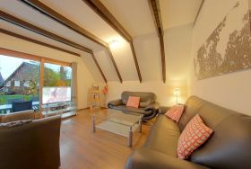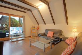 Wohn-, Ess- und Küchenbereich, ein Schlafzimmer mt Doppelbett, sowie ein modernisiertes Duschbad befinden sich im Erdgeschoss. Wohnbereich mit Flat-TV, und direktem Ausgang zur Terrasse. Absosfort steht Ihnen auch kosenloses W-Lan zur Verfügung