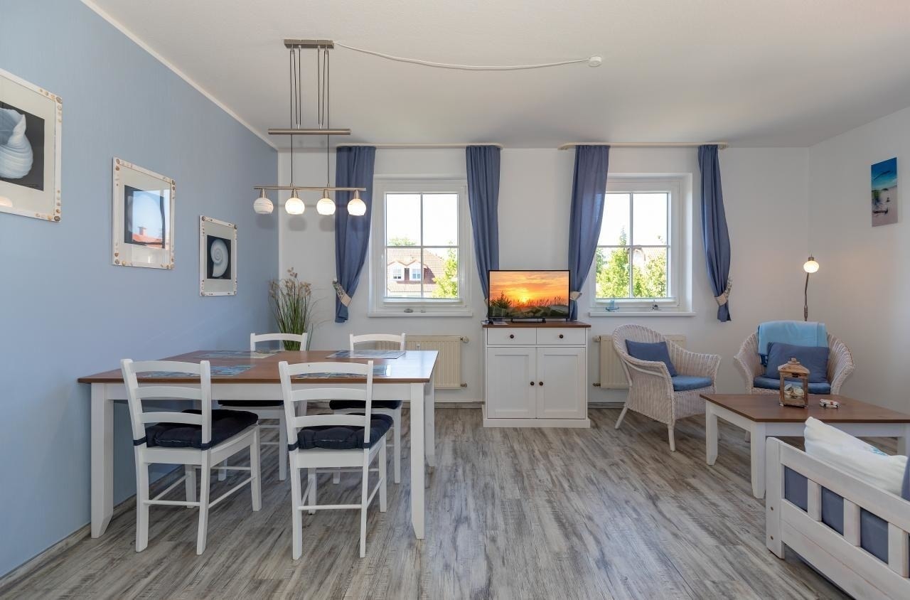 Vom Eingangsbereich erschließt sich Ihnen der Wohn- und Essbereich. Der große Esstisch für 4 Personen und die großzügige Sitzgruppe in liebevoll dekoriertem Ambiente macht diesen Raum zu einem echten Treffpunkt für die ganze Familie.