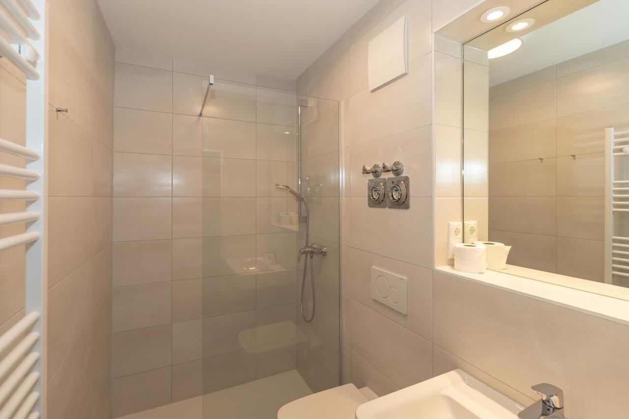 Das Bad verfügt über eine Dusche, ein WC, ein Waschbecken mit Unterschrank, einen Handtuchheizkörper, einen beleuchteten Spiegel, Tritthocker und viele Ablagemöglichkeiten.