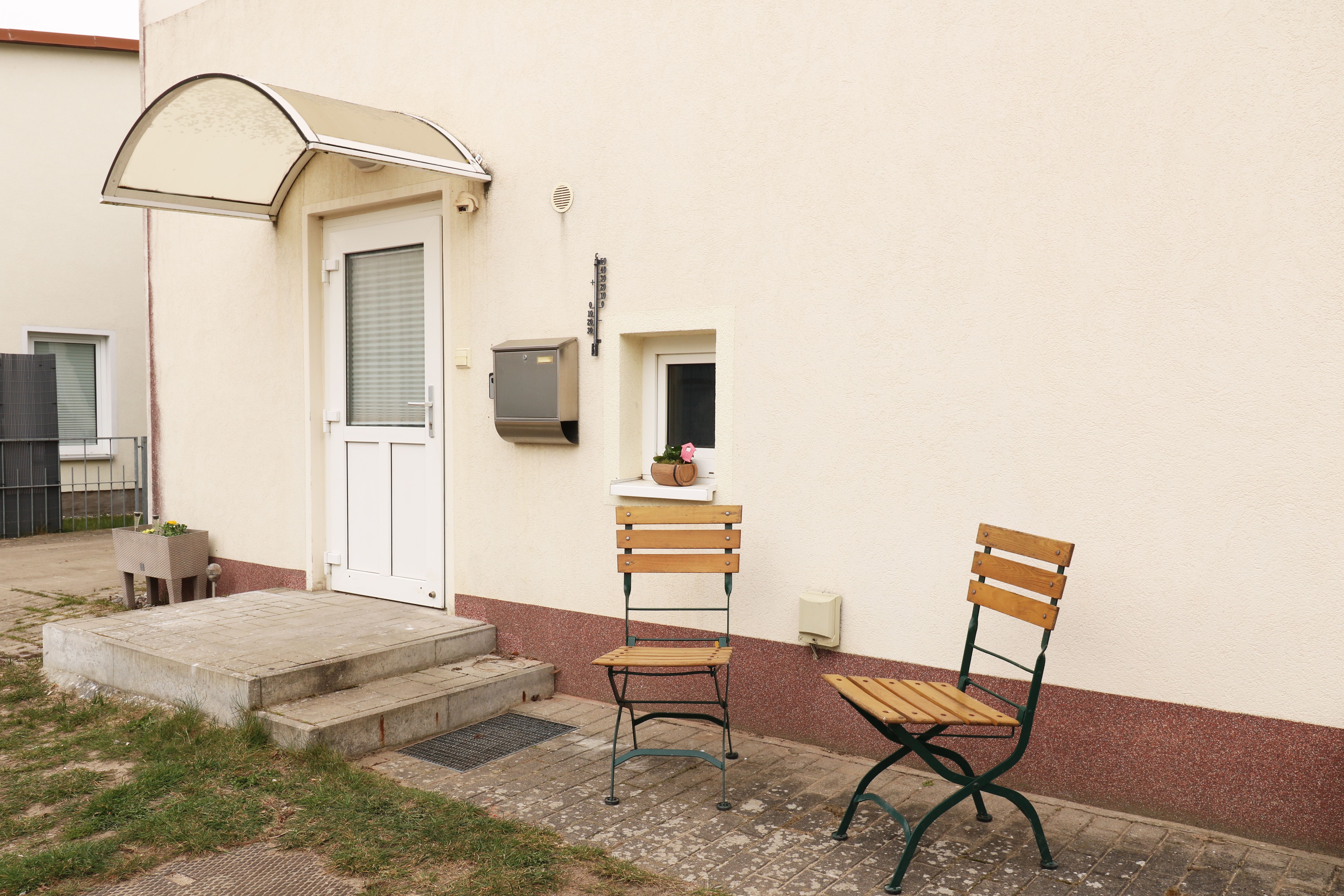 Parkplatz; Die 2 Stühle und das Tischchen im Hof dienen nur der Raucherpause außerhalb der Nichtraucherwohnung