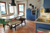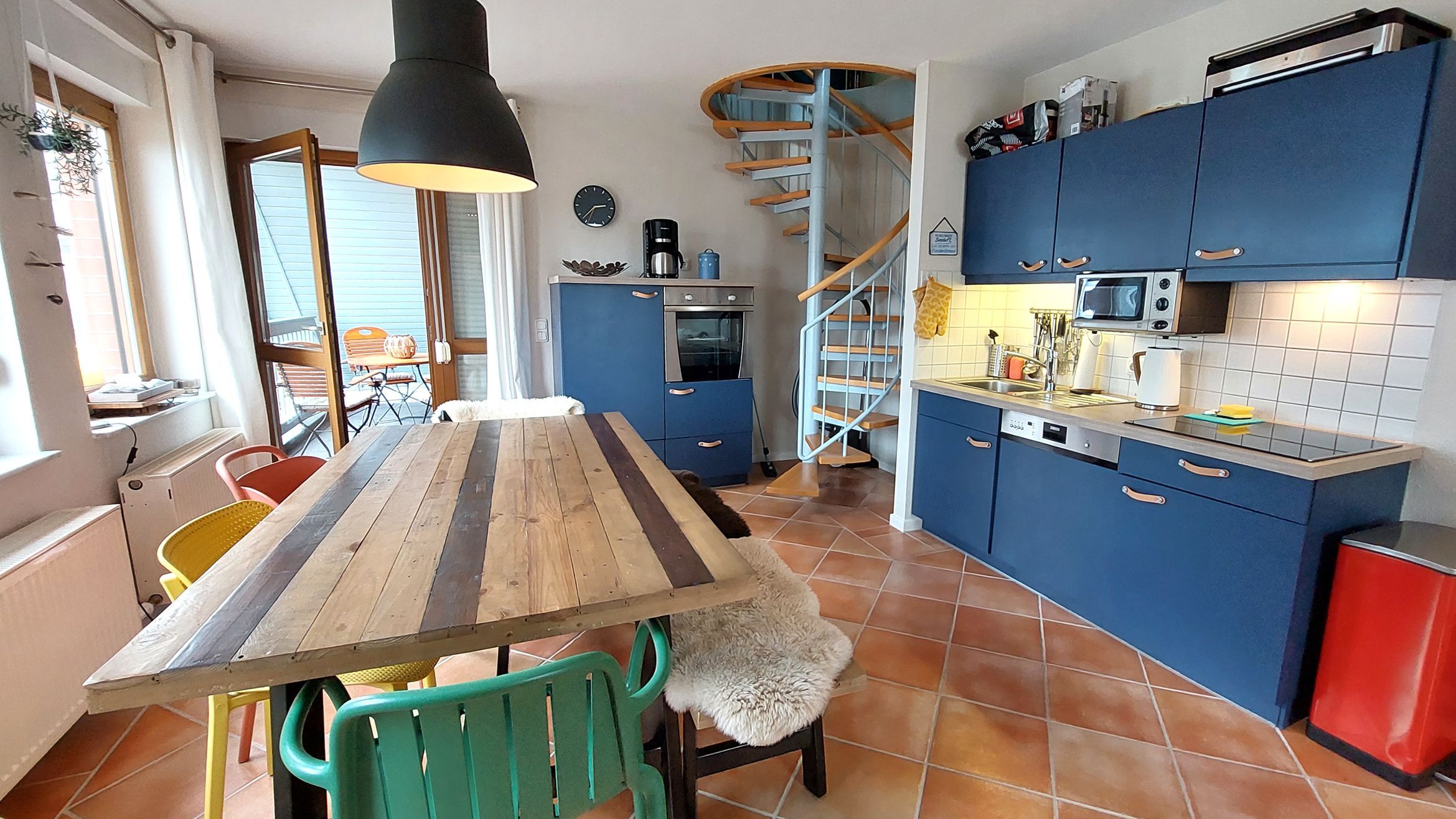 Der geräumige Wohn- und Essbereich beinhaltet eine moderne Küchenzeile mit Cerankochfeld, Mikrowelle, Geschirrspüler und Kühlschrank (samt Gefrierfach). Backofen, Raclette, Elektrogrill und viele weitere Küchenhelfer sorgen dafür, das man sich auch im Urlaub bequem selbst verpflegen kann. Der Esstisch bietet Sitzgelegenheiten für bis zu 6 Personen.