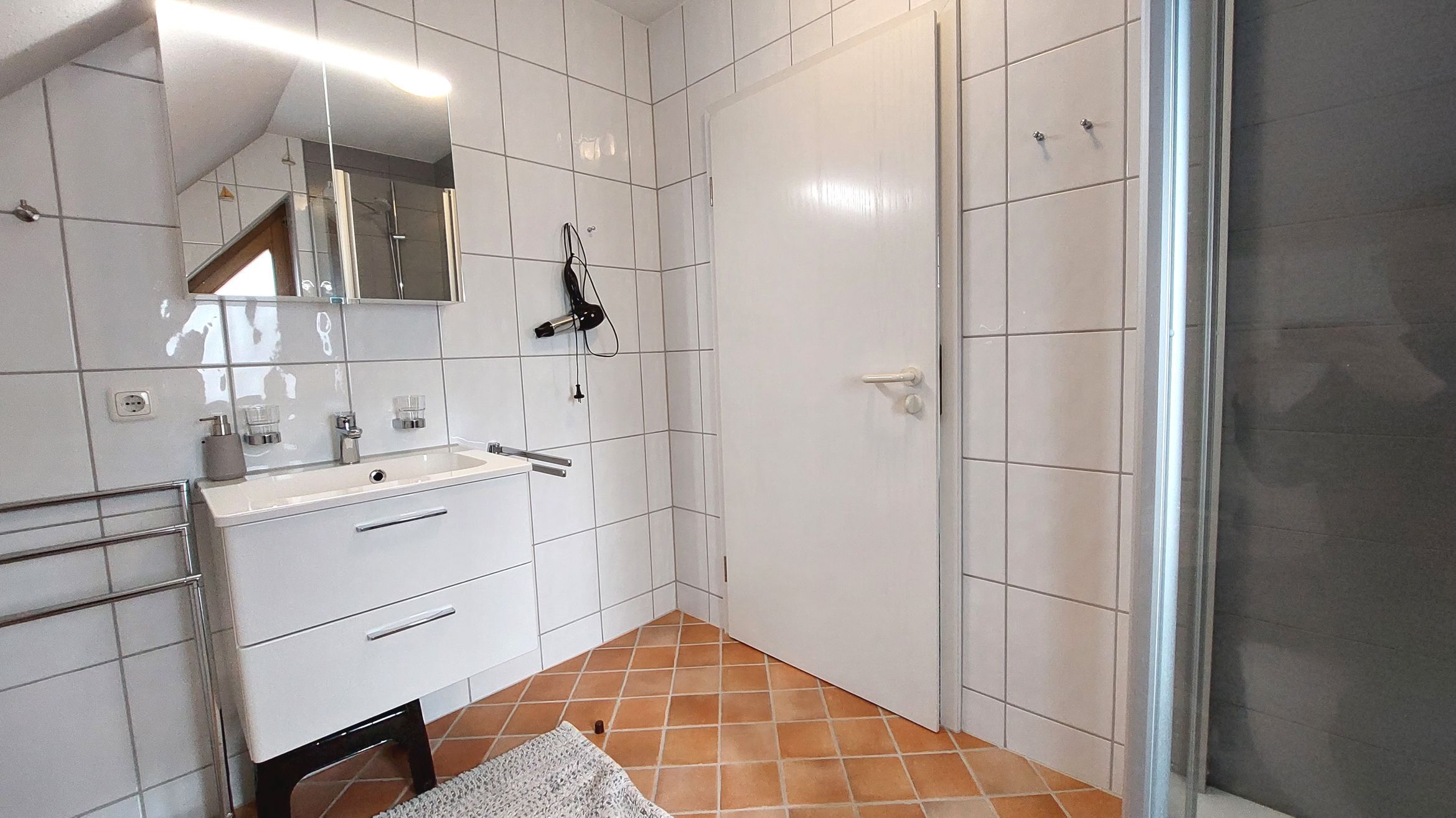 Vom Flurbereich samt Garderobe gelangen Sie ins Tageslichtbad, welches über WC, Dusche, Kosmetikspiegel und Fön verfügt.