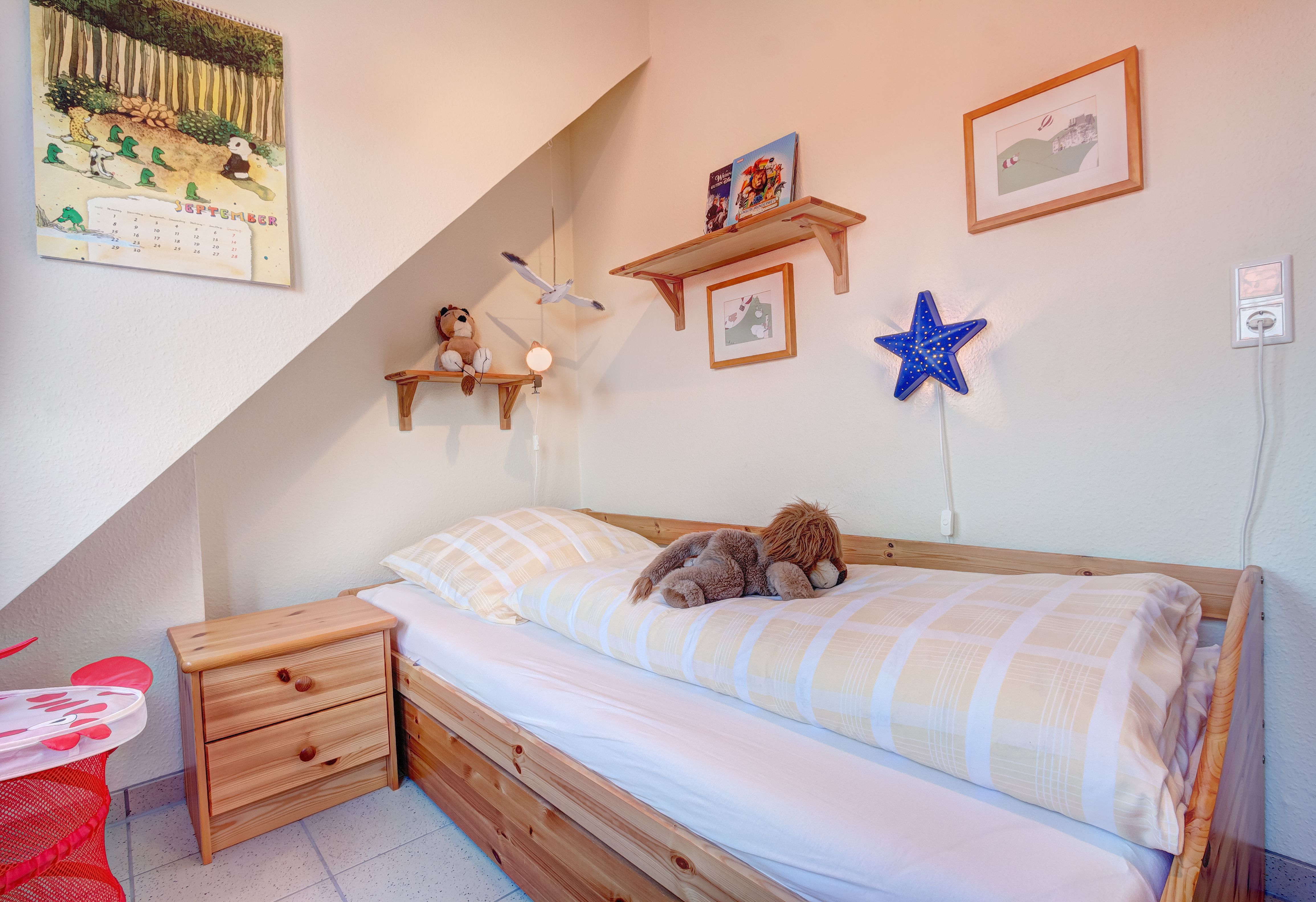 Im Erdgeschoss finden Sie einen hellen Wohnraum mit angeschlossener Küche und Esstisch sowie ein kleines Gäste-WC. Die Schlafräume (einmal mit Doppelbett und Fernseher, einmal kindgerecht und mit Einzelbett ausgestattet) sowie ein Duschbad befinden sich im Obergeschoss. Zusätzlich stehen Ihnen die Sonnenterasse inkl. Gartenmobiliar, ein Abstellraum und ein Parkplatz am Haus zur Verfügung.