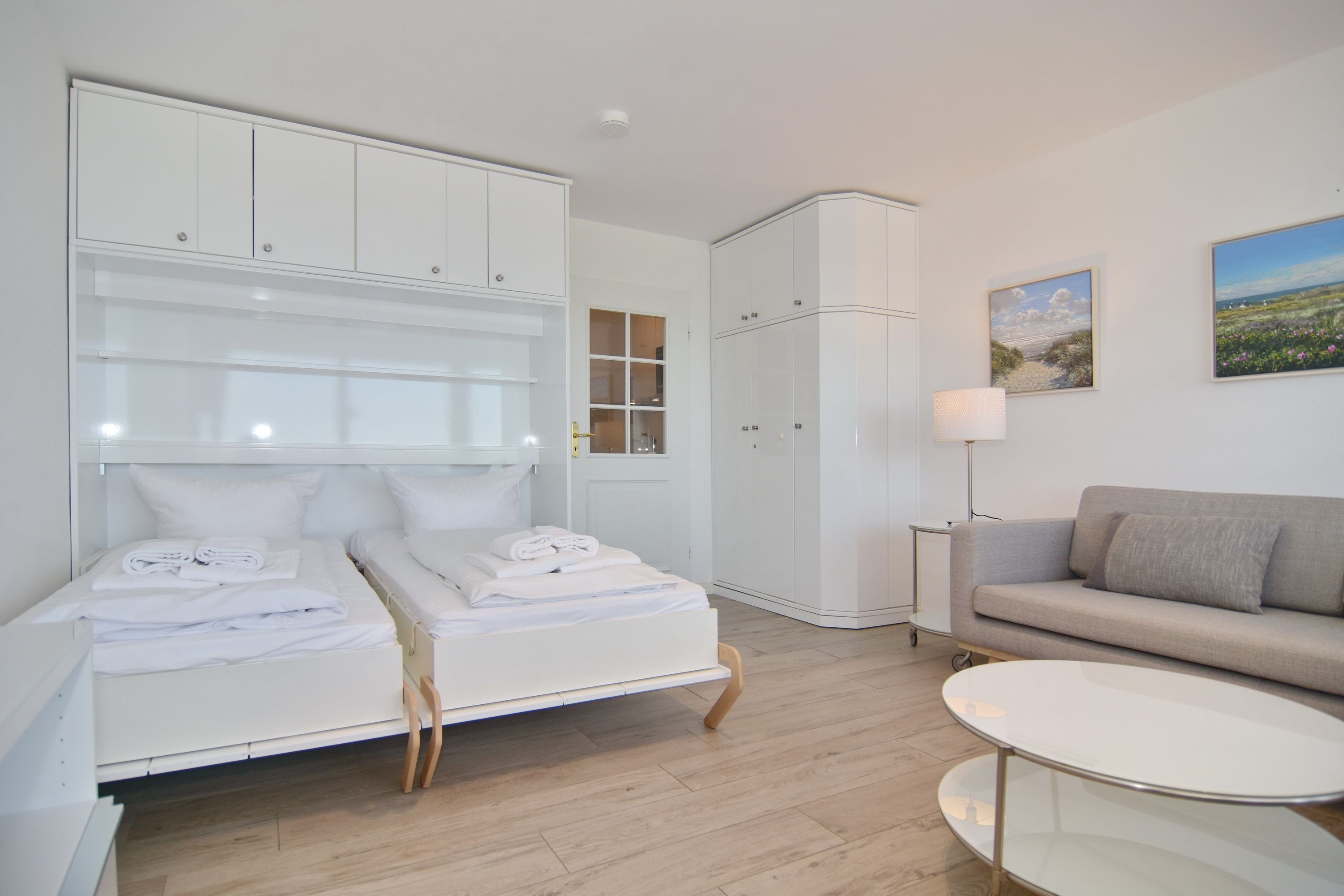 1-Zimmer-Apartment im 5. OG im Haus Metropol mit freiem Meeresblick und großem Westbalkon mit Balkonmöbeln. Ca. 34 m², Nichtraucher. Die Wohnung ist komplett gefliest. Kombinierter Wohn-/ Schlafraum mit Einzelschrankbetten, Essplatz am Fenster und 2-Sitzercouch mit Beistelltisch, TV, Radio, WLAN (ohne Gewähr), moderne Küchenzeile im Flurbereich mit Mikrowelle/Backofen-Kombigerät, Geschirrspüler und Cerankochfeld, Kühlschrank mit Gefrierfach. Duschbad/WC.