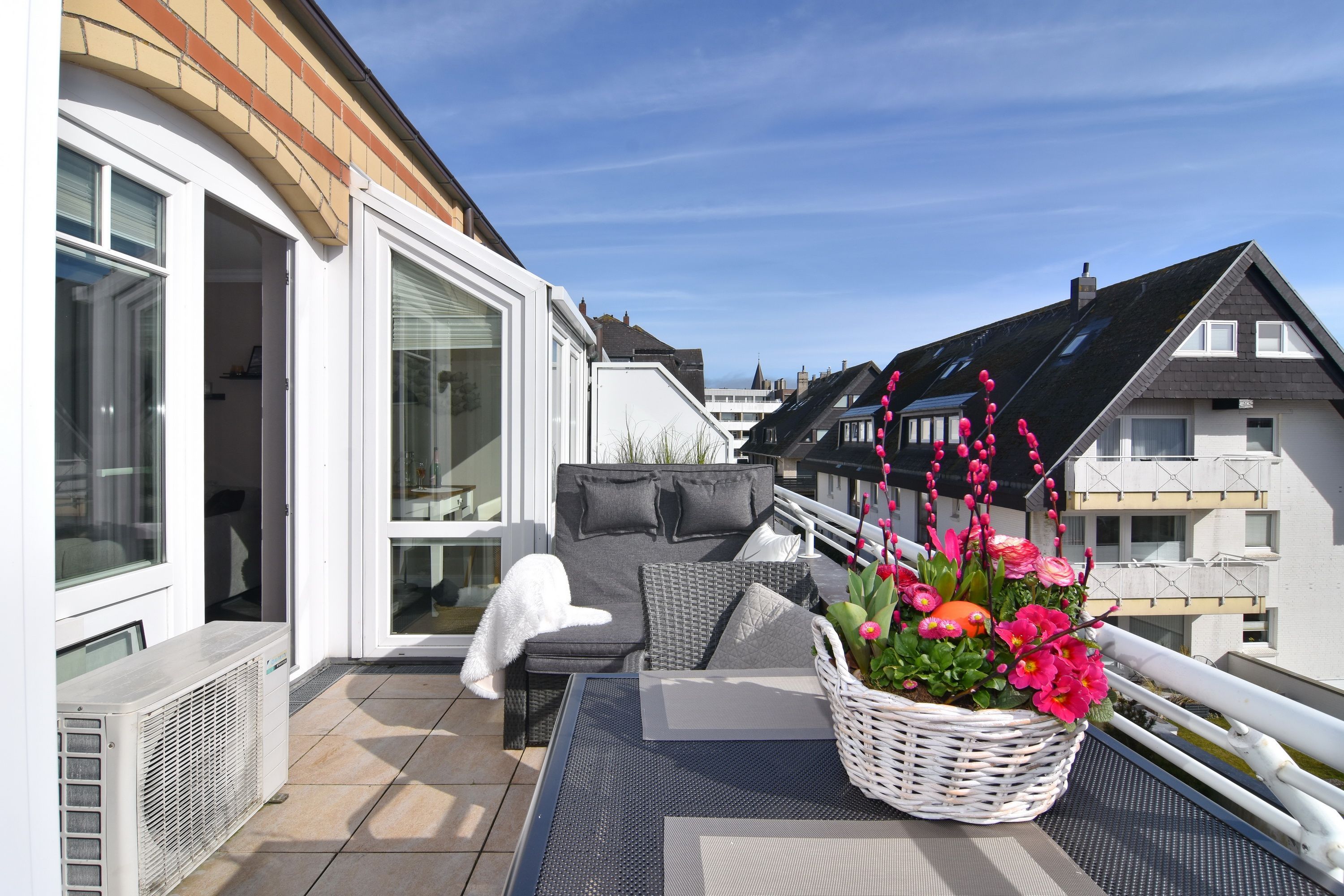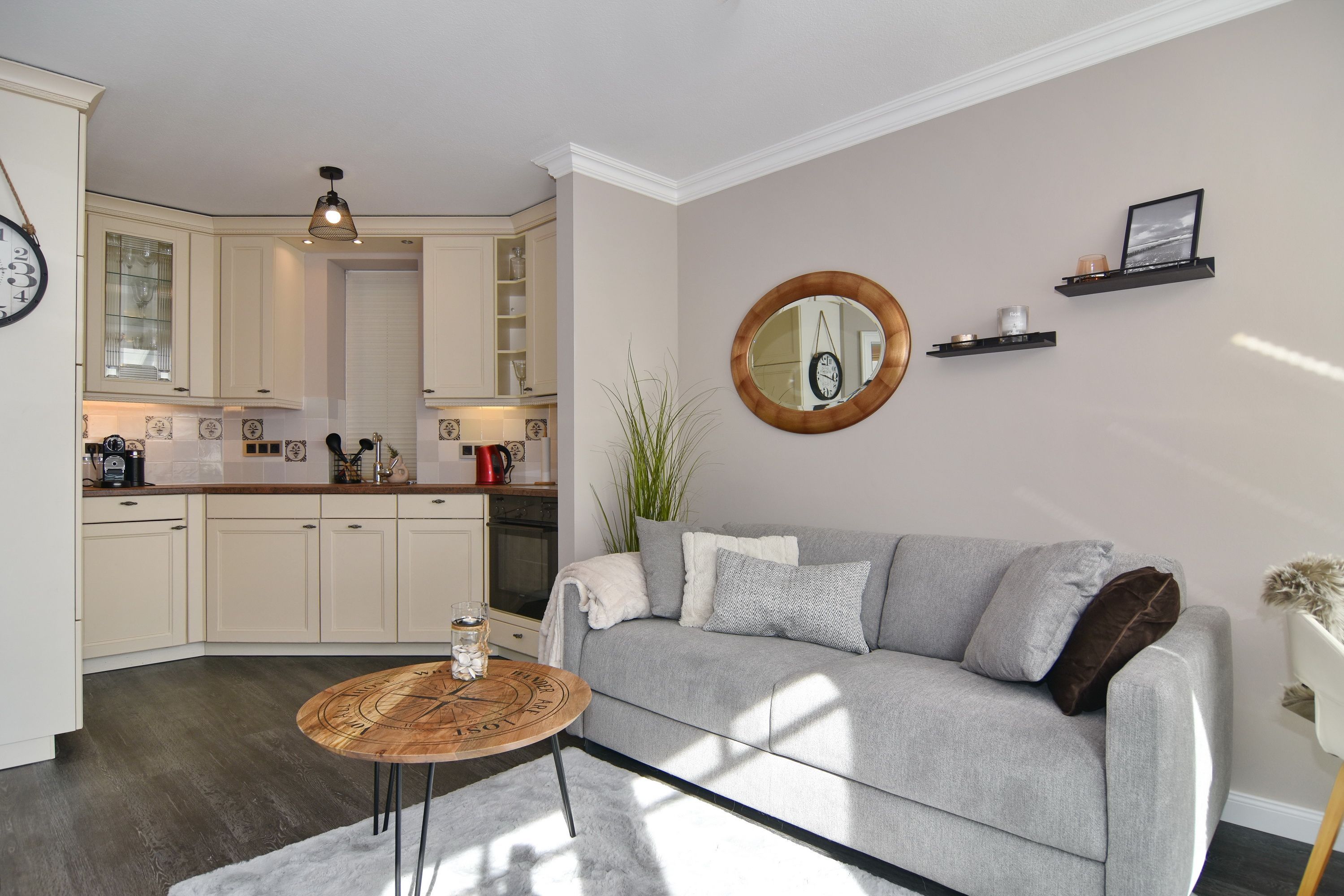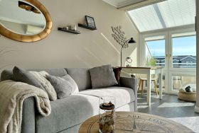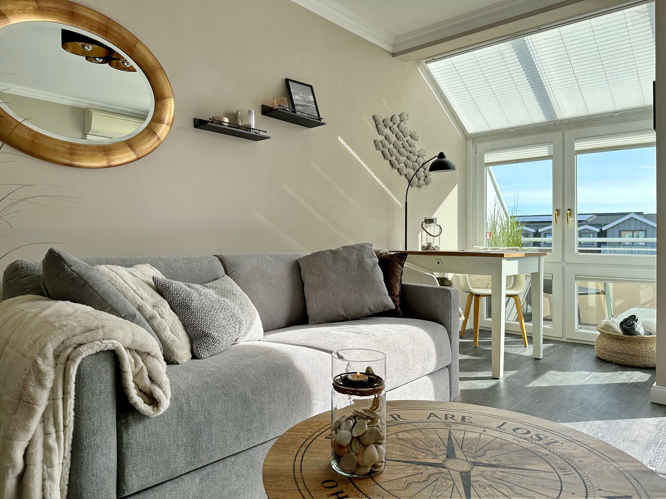 Wunderschöne 2-Zimmer-Wohnung im 2. OG der Residenz Bismarck. Direkt im Herzen Westerlands erwartet Sie eine lichtdurchflutete und modern eingerichtete Wohnung. Die Wohnung verfügt über ein Wohn- und ein Schlafzimmer. Von beiden Räumen gelangen Sie auf die großzügige Südterrasse. Im Wohnzimmer befindet sich der Essplatz im Wintergarten und bietet Ihnen selbst an grauen Tagen viel Licht. Das Sofa verfügt über eine Schlaffunktion, so dass Sie auch getrennt schlafen können. Die offene Küche verfügt über Backofen, Mikrowelle, Cerankochfeld, Kühlschrank mit Gefrierfach, Wasch-Trockner, Nespressomaschine und Kaffeefiltermaschine. Das Schlafzimmer hat neben dem komfortablen Boxspringbett (180x200), einen Kleiderschrank, TV und kleine Leseecke mit Sessel im dazugehörigen Wintergarten. Sämtliche Fenster sind mit Plissees versehen, im Schlafzimmer sind entgegen der Bilder inzwischen Verdunklungsplissees angebracht worden. Wohn- und Schlafraum verfügen über eine Klimaanlage. Das Badezimmer besteht aus Wanne mit Duschvorrichtung, Waschbecken und WC. Die Betten sind zur Anreise bezogen.