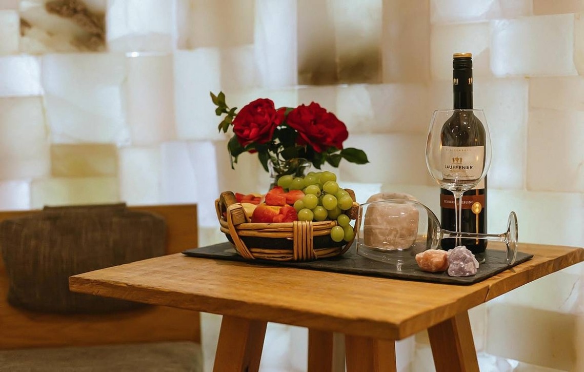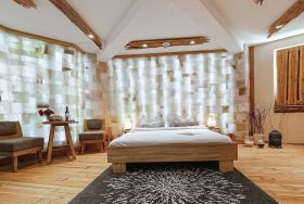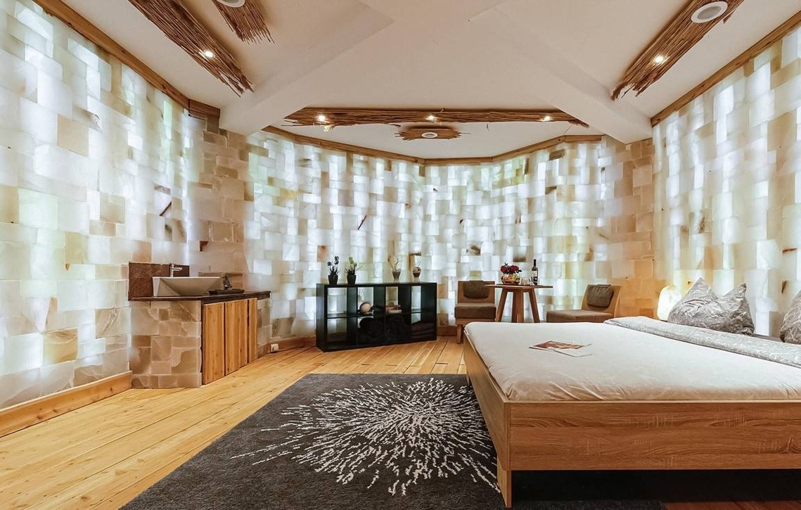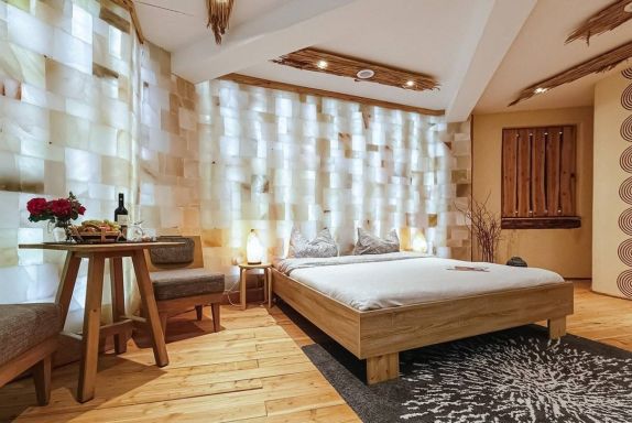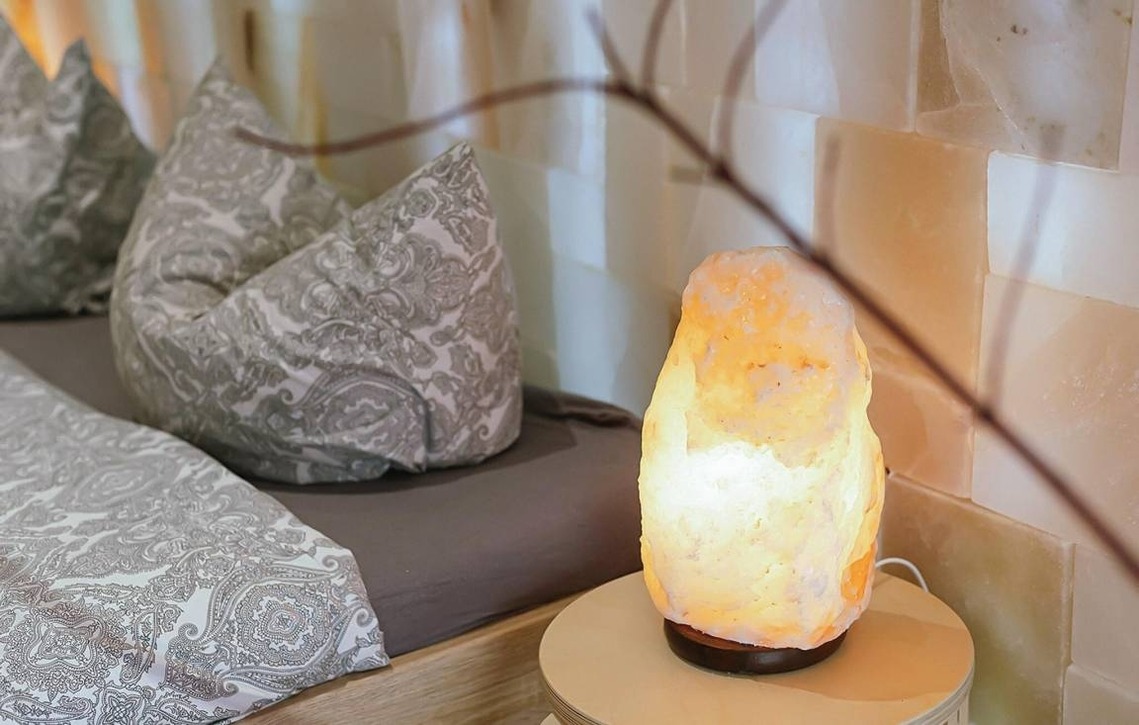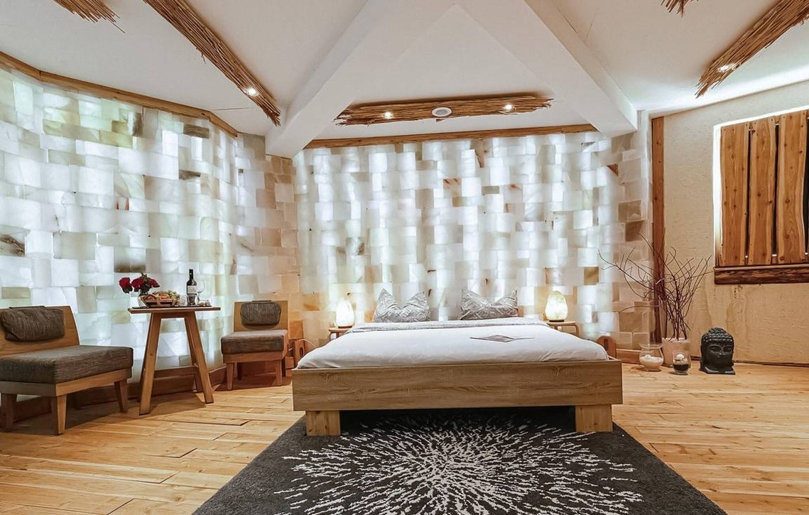 Erleben Sie im Salzturm eine Übernachtungsmöglichkeit der besonderen Art. 32 Tonnen Natursalz sind hier verbaut in Fußböden und Wände, die hinterleuchtet werden. Das Gästezimmer befindet sich in der 3. Etage des Salzturms und bietet ein einzigartiges, romantisches Ambiente.