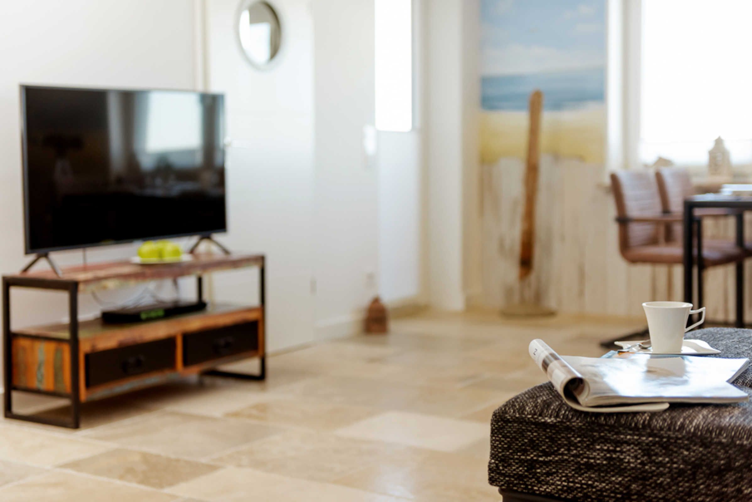 Diese wunderschöne Wohnung ist für 4 Personen ausgestattet. Sie verfügt über 2 Schlafzimmer die jeweils mit einem Fernseher ausgestattet sind. Vom Wohnzimmer aus haben Sie einen fantastischen Blick auf die Ostseite, das Wattenmeer, von Hörnum. Zur Wohnung gehört ein Duschbad und eine sep. kleine Küche, die mit allem ausgestattet ist, was man im Urlaub braucht. In der Sauna sitzend können Sie bis auf die Nachbarinseln schauen. Die gesamte Wohnung verfügt über eine Fussbodenheizung und kindersichere Steckdosen sowie über einen DVD/Bluerayplayer.