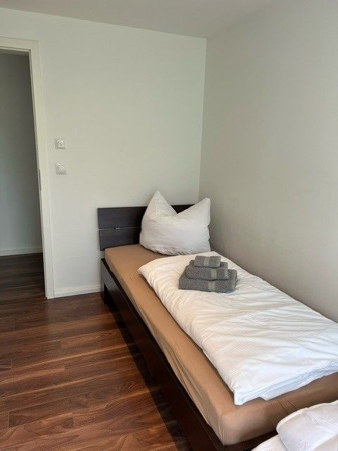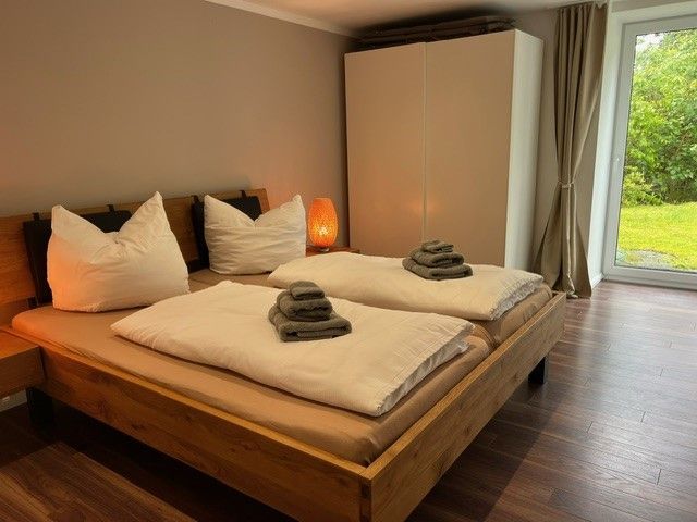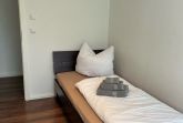 Im ersten Schlafzimmer bedindet sich ein Doppelbett (2x 90cm breite Matratzen), während im zweiten Schlafzimmer zwei Einzelbetten (je eine 90cm breite Matratze) vorbereitet sind.