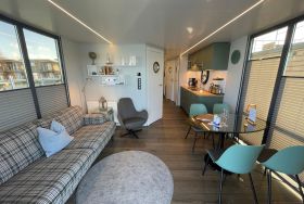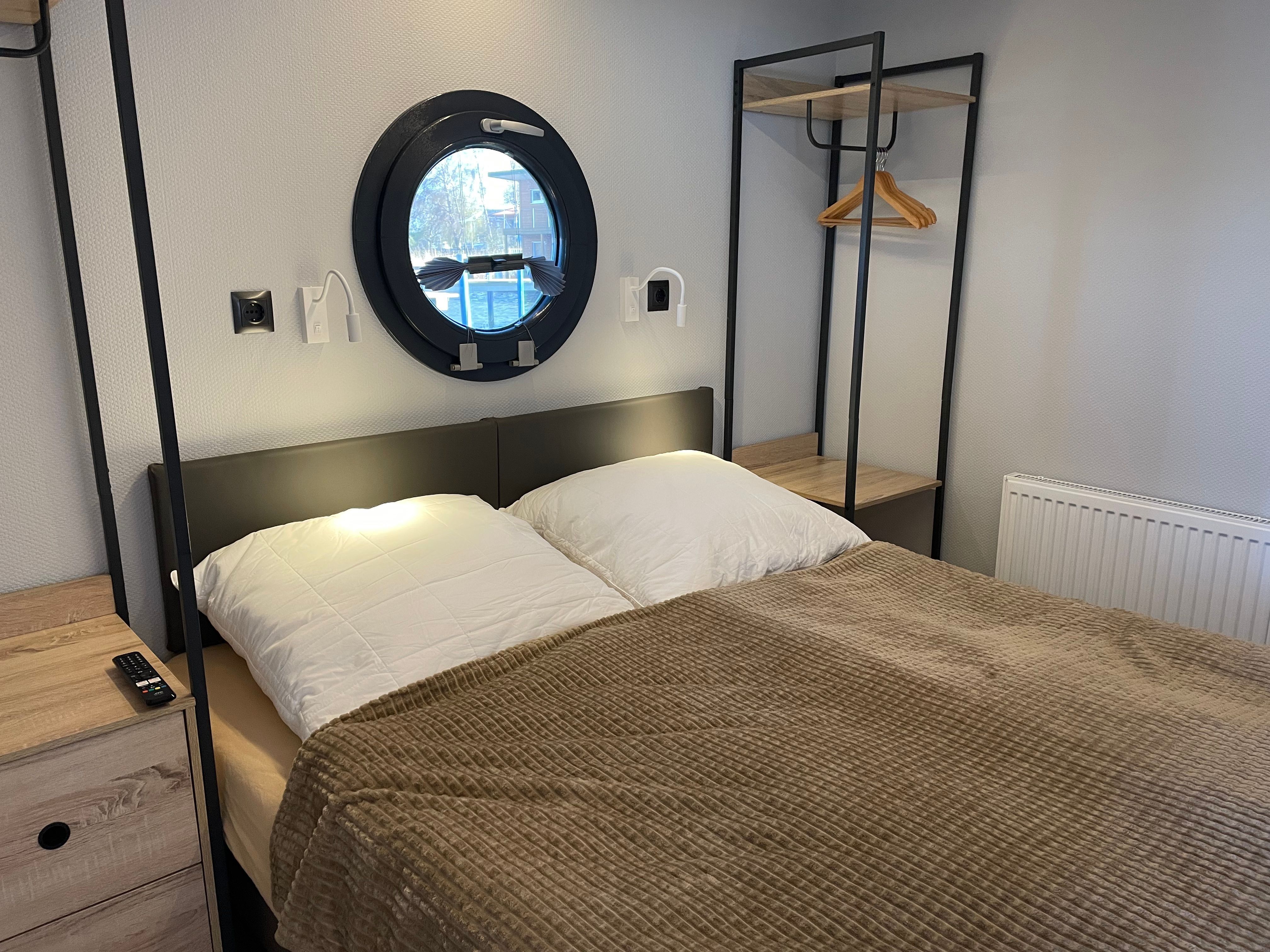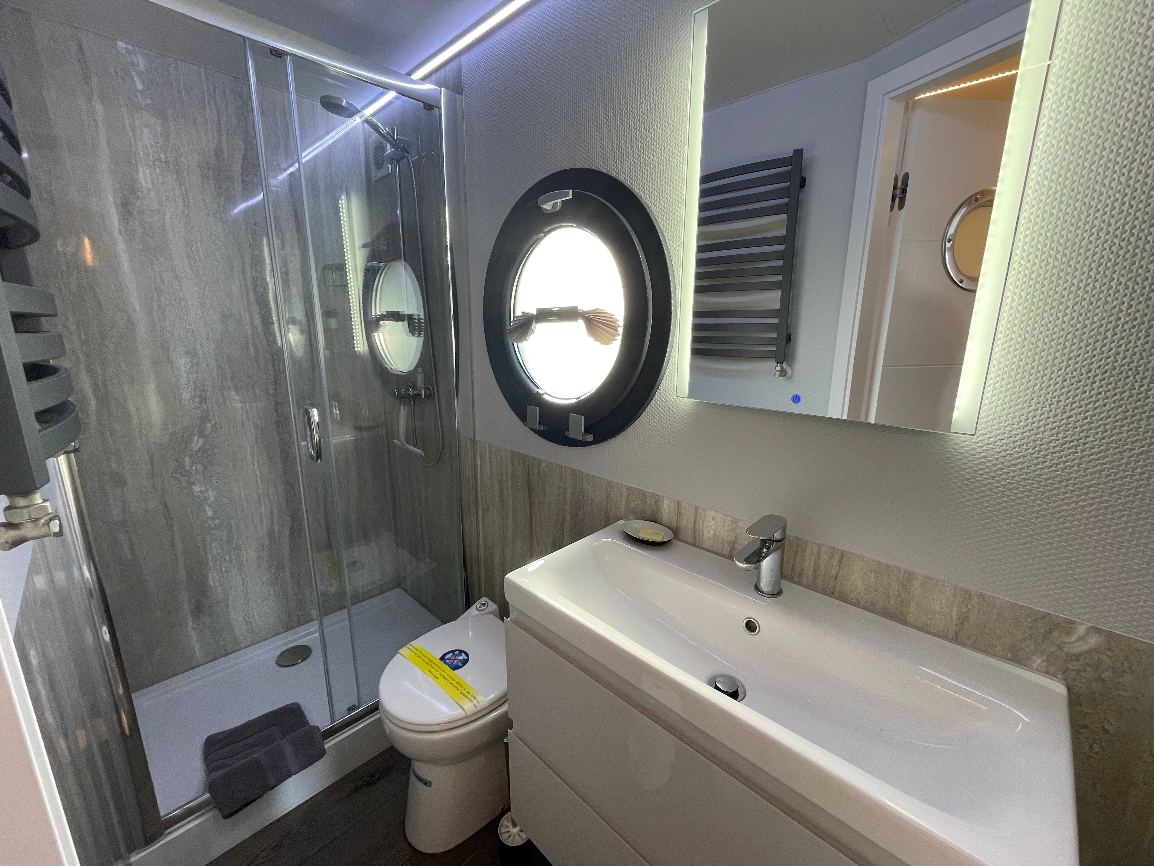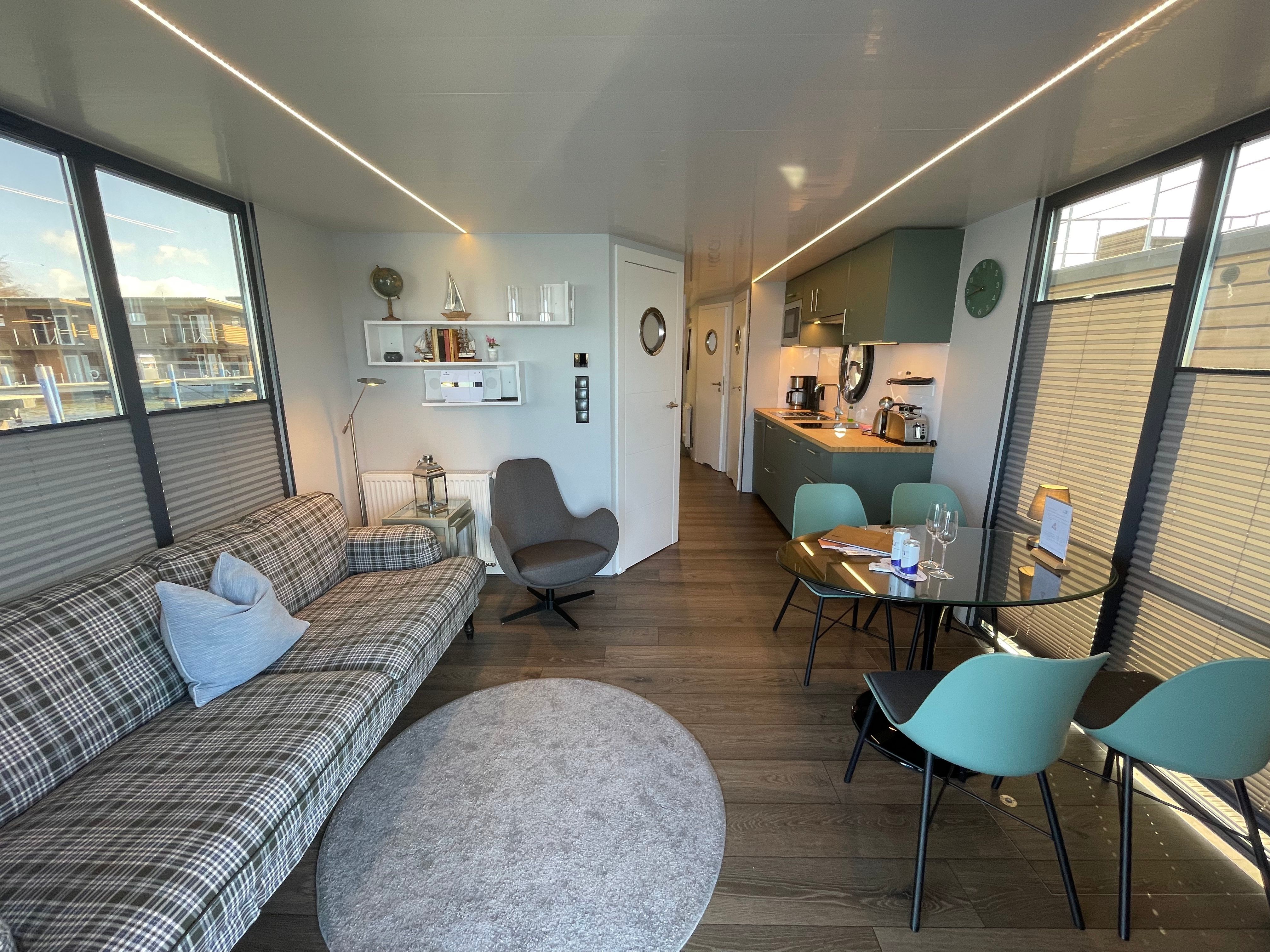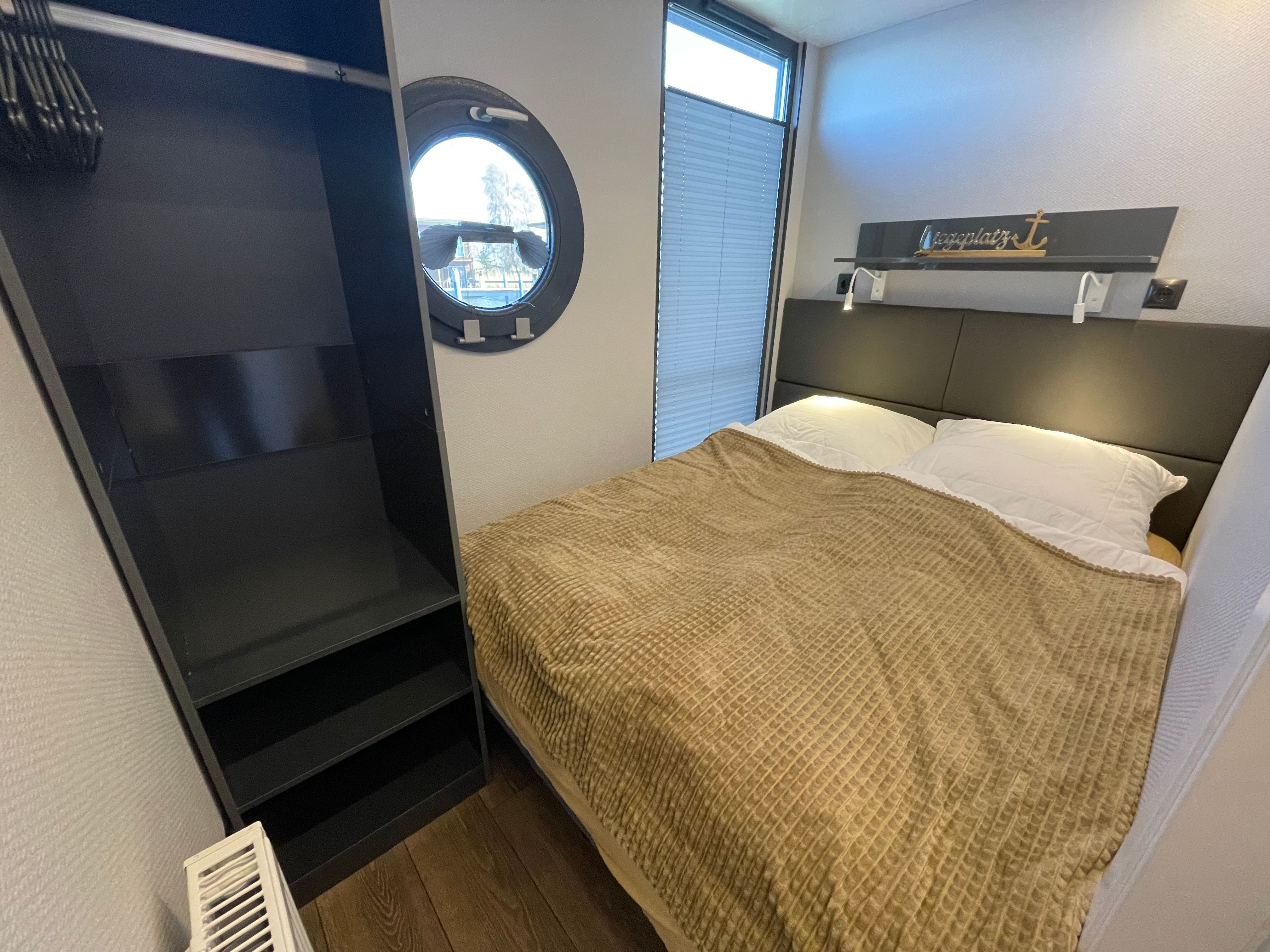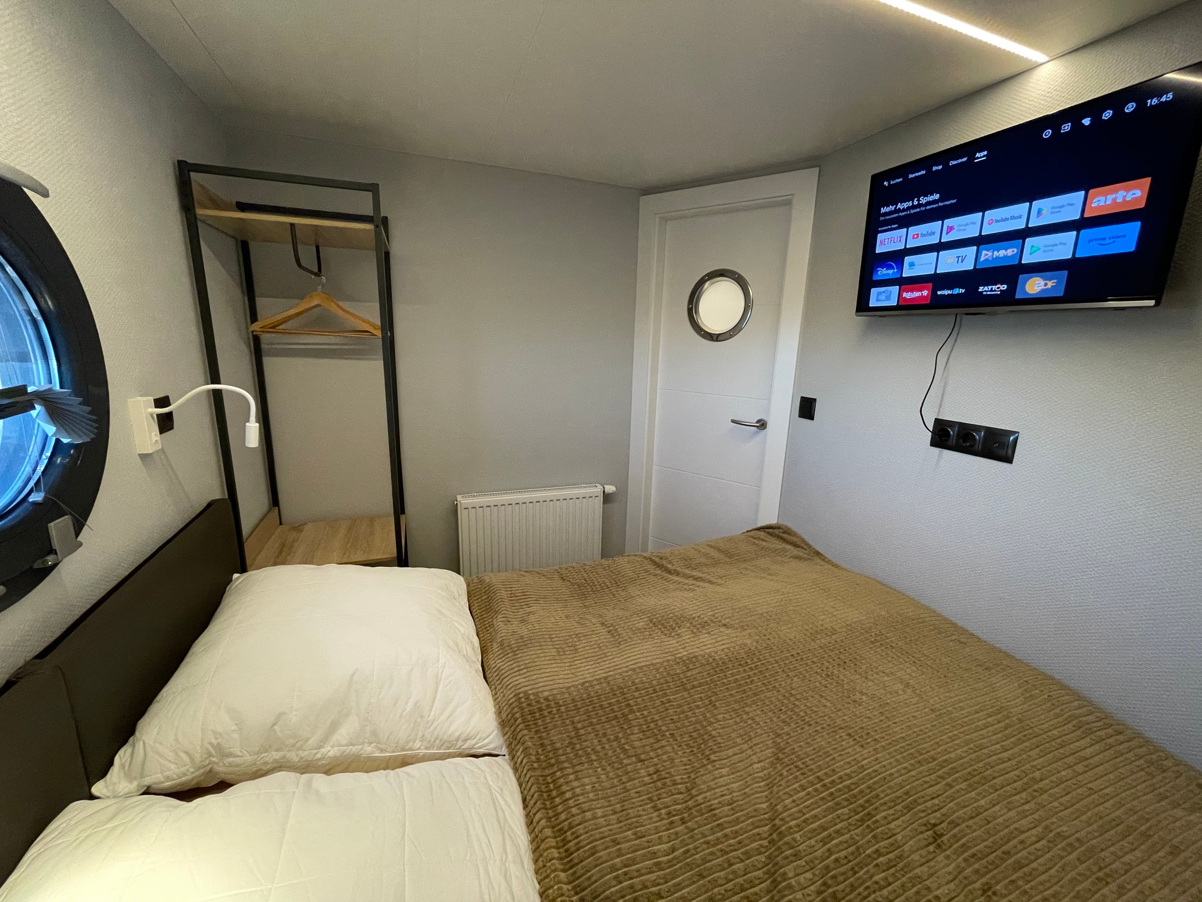 Im Inneren des Hausbootes finden Sie neben dem Wohnraum mit Fußbodenheizung für kalte Tage zwei Schlafräume mit je einem Doppelbett sowie ein modernes Duschbad. Genügend Stauraum finden Sie in den Schränken an Bord.