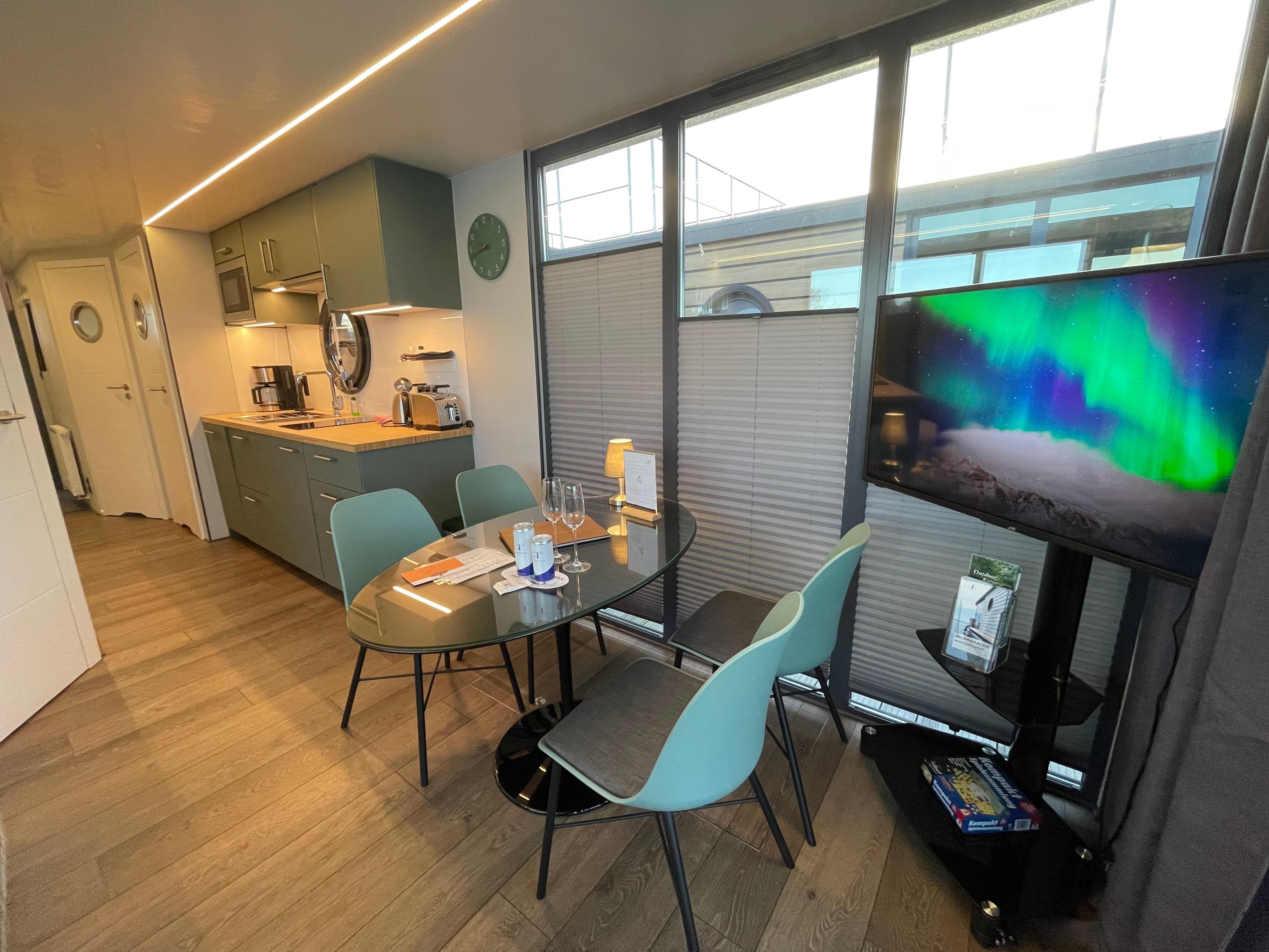 Dieses großzügige festliegende Hausboot bietet Ihnen auf ca. 54 qm Bootsfläche den ganzen Komfort einer modernen und hochwertigen Ferienwohnung mit Sonnen- und Dachterrasse. Das besondere Highlight von Fjord Baltica ist der großzügige Wohnraum mit direktem Blick auf das Wasser. In diesem lässt es sich entspannt auf der Couch verweilen oder Sie kommen am großzügigen Tisch zu einem leckeren Essen oder Spieleabend zusammen.