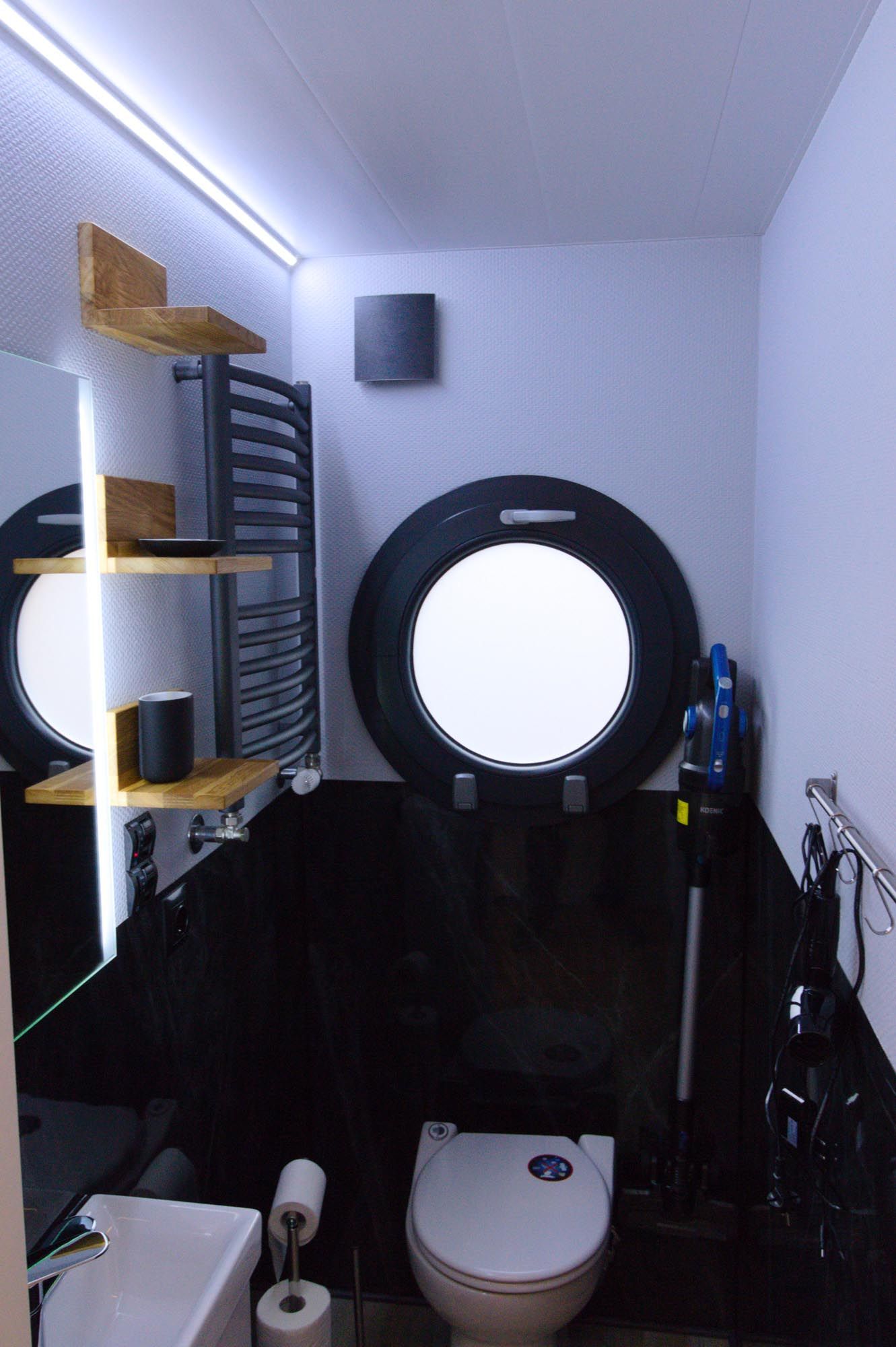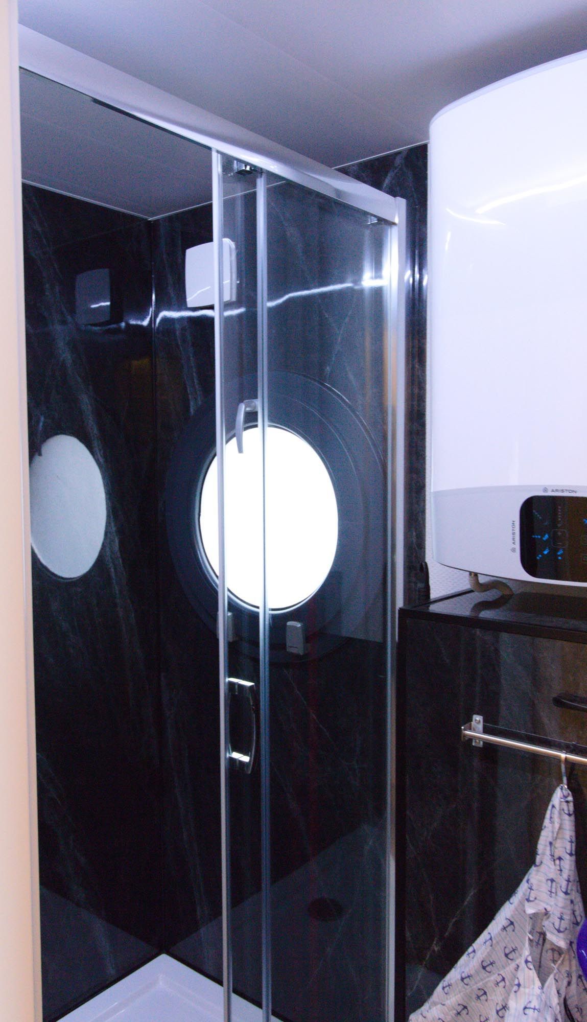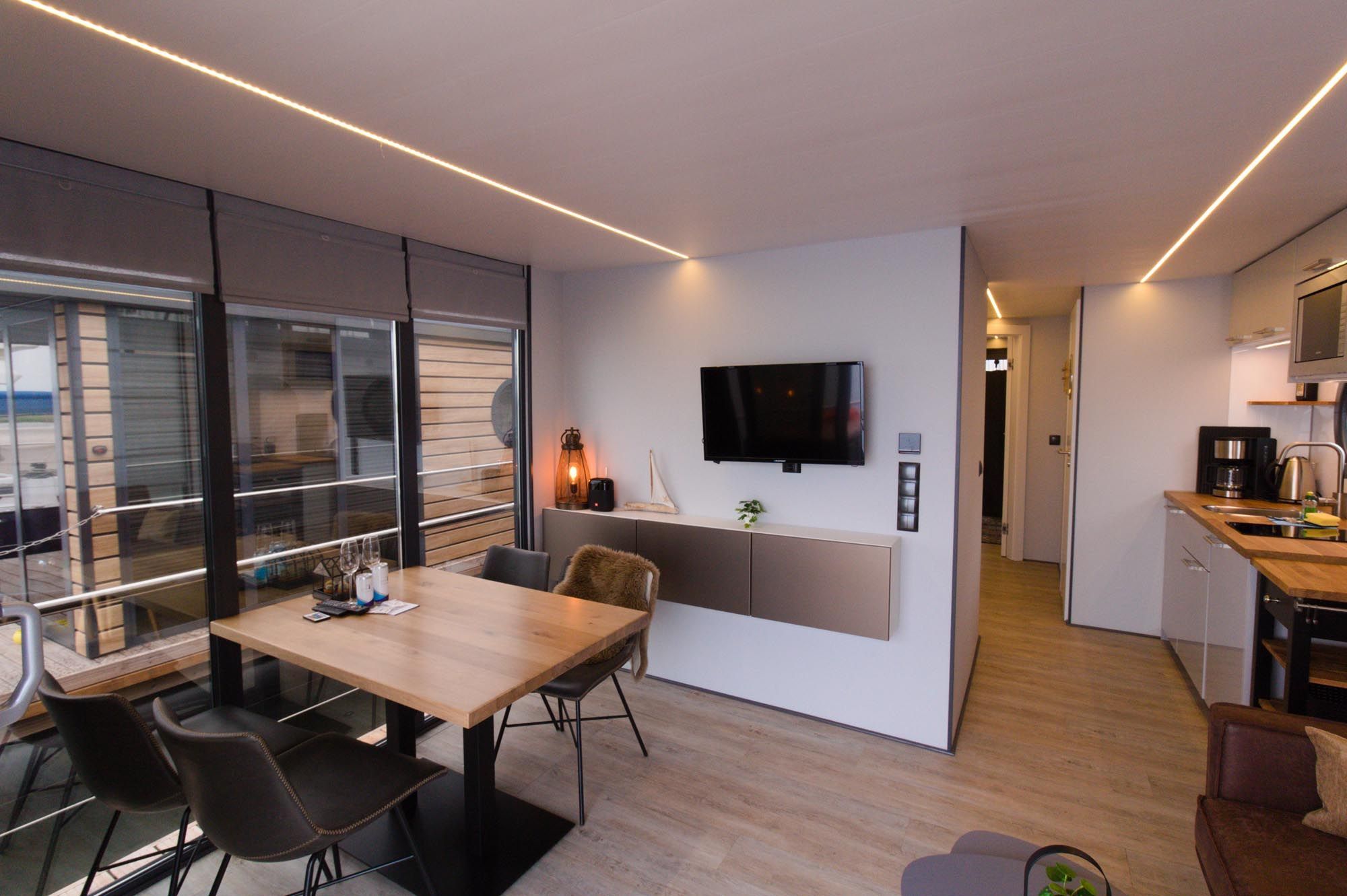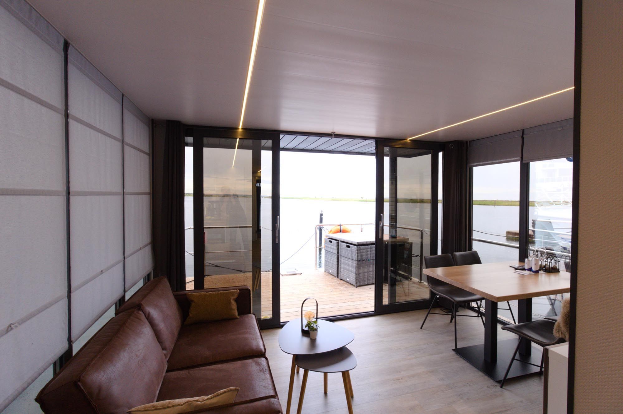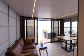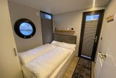 Im Inneren des Hausbootes finden Sie neben dem Wohnraum mit Fußbodenheizung für kalte Tage zwei Schlafräume mit je einem Doppelbett sowie ein modernes Duschbad. Genügend Stauraum finden Sie in den Schränken sowie in den Schubladen unter den Betten.
